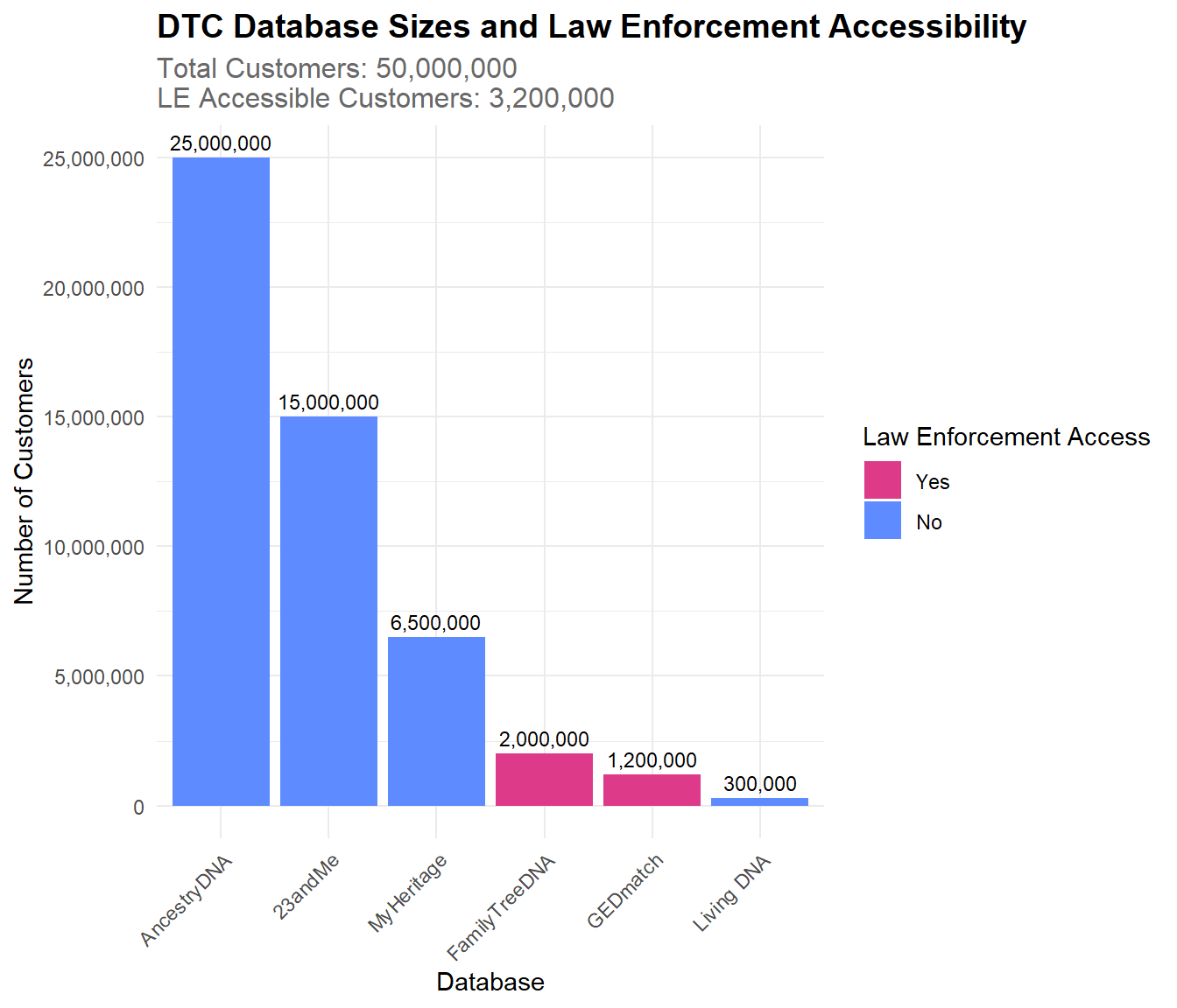 Here, we explore the size of each of the six major DTC databases, as well as their Law Enforcement (LE)’s access to each database.