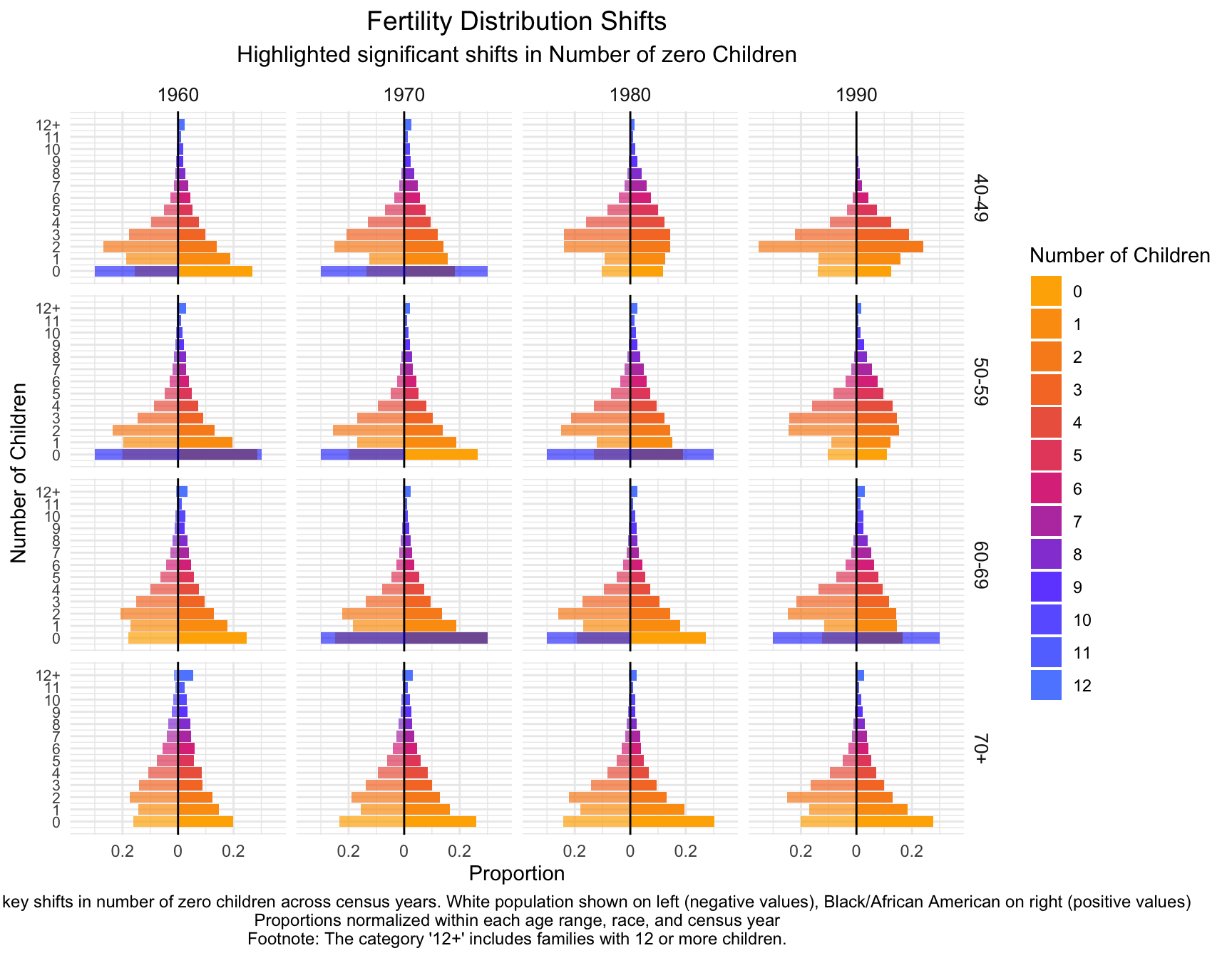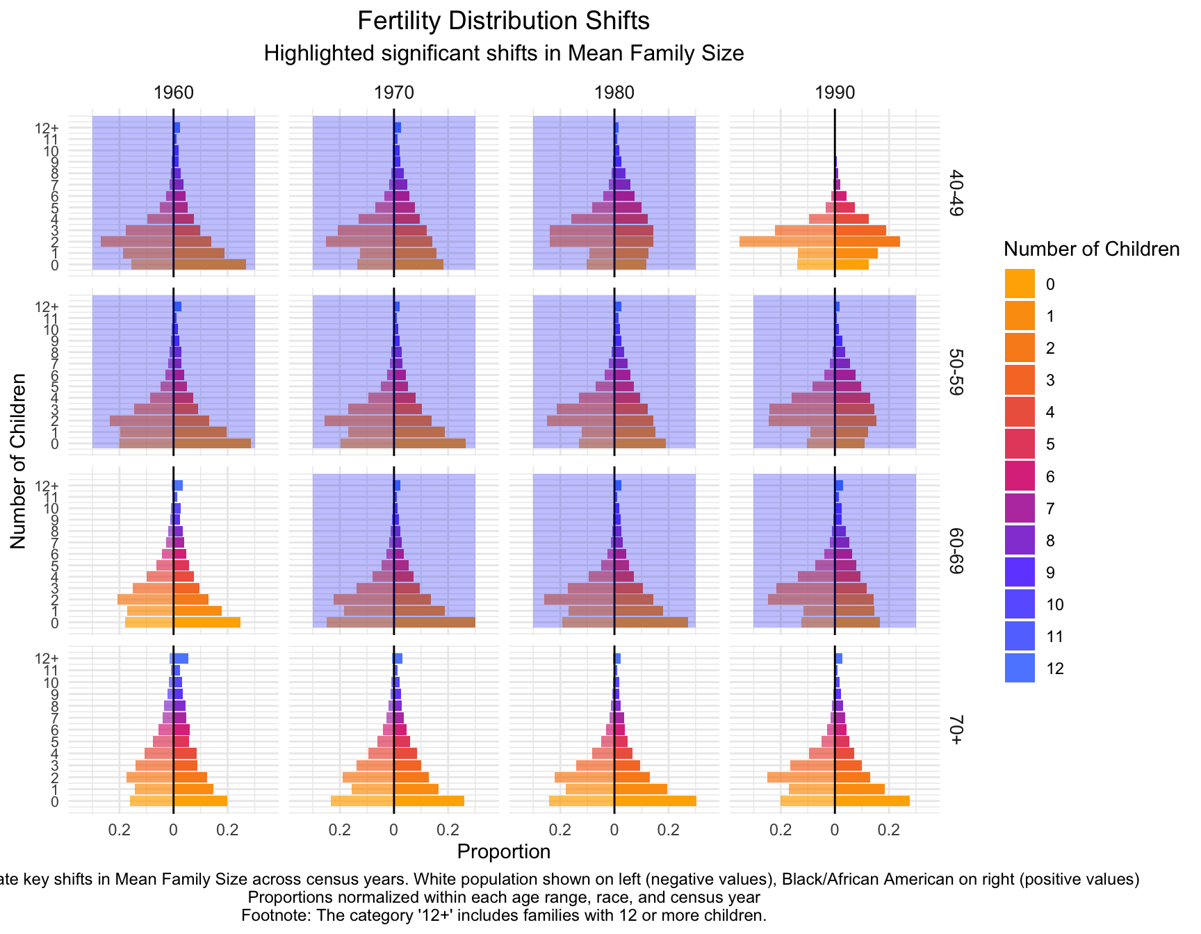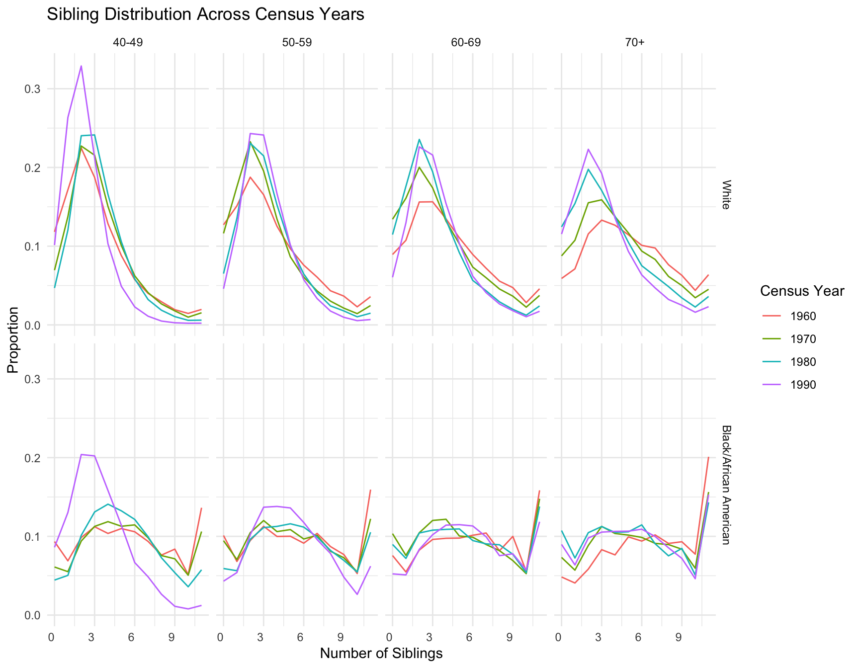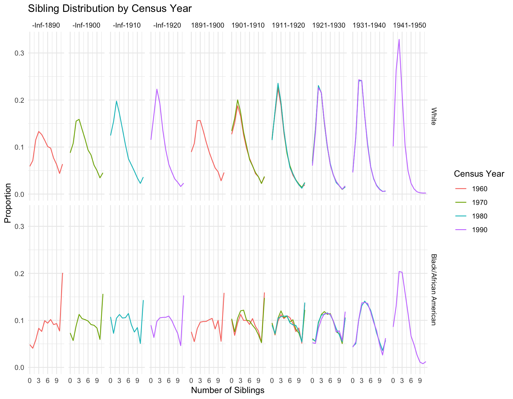 Create a visualization showing how sibling distributions change across census years for different races and birth ranges.