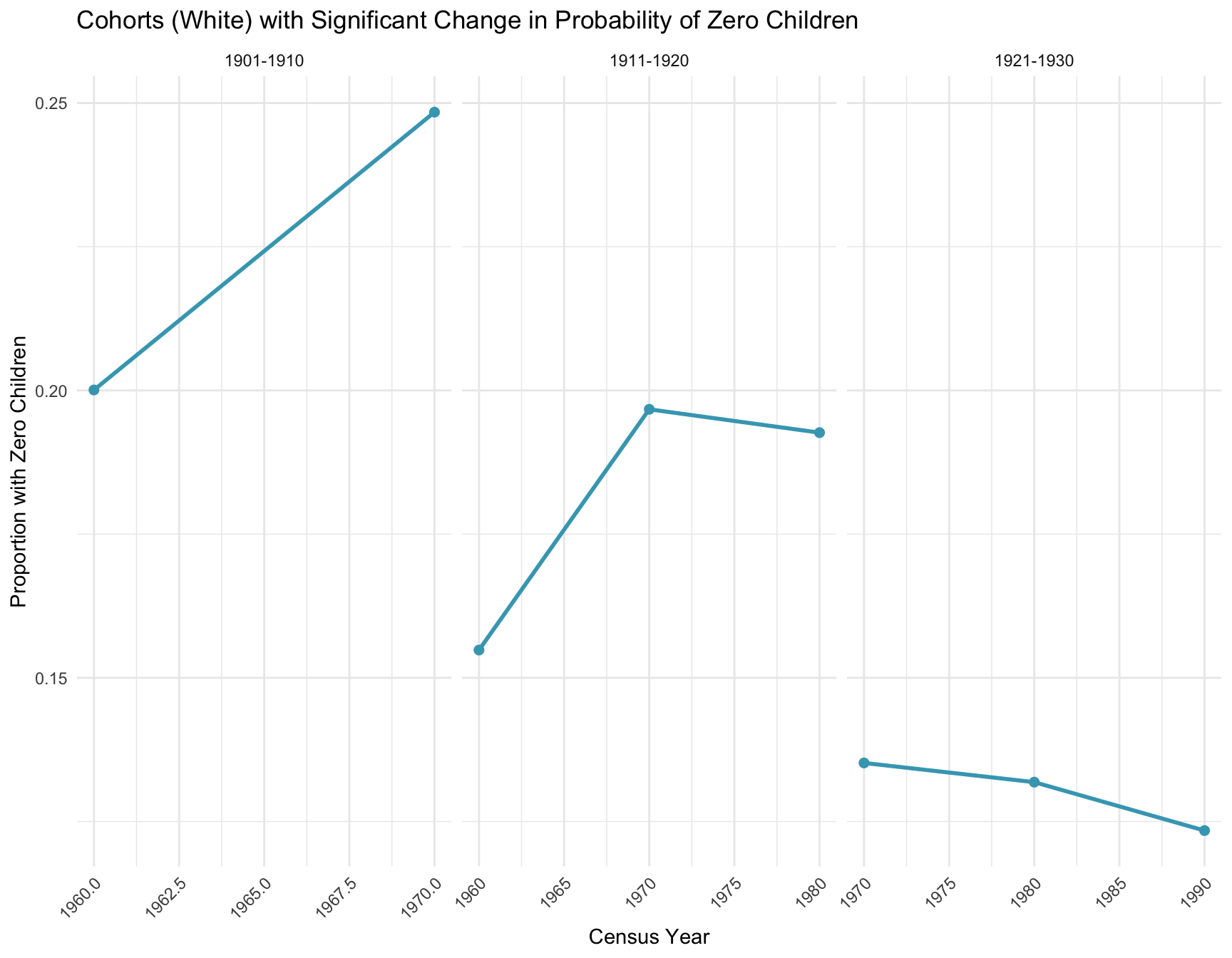 RESULT: The table shows that cohorts 1901-1910, 1911-1920, 1921-1930 have significant change in probability of individuals with zero siblings in white population.