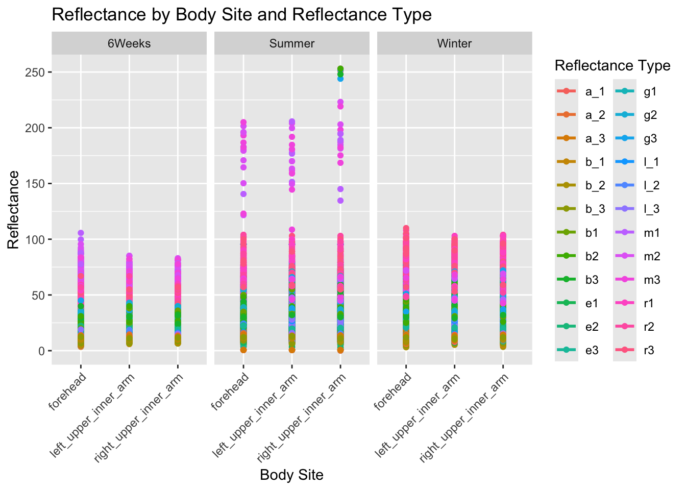 labs(title = "Reflectance by Body Site and Reflectance Type",