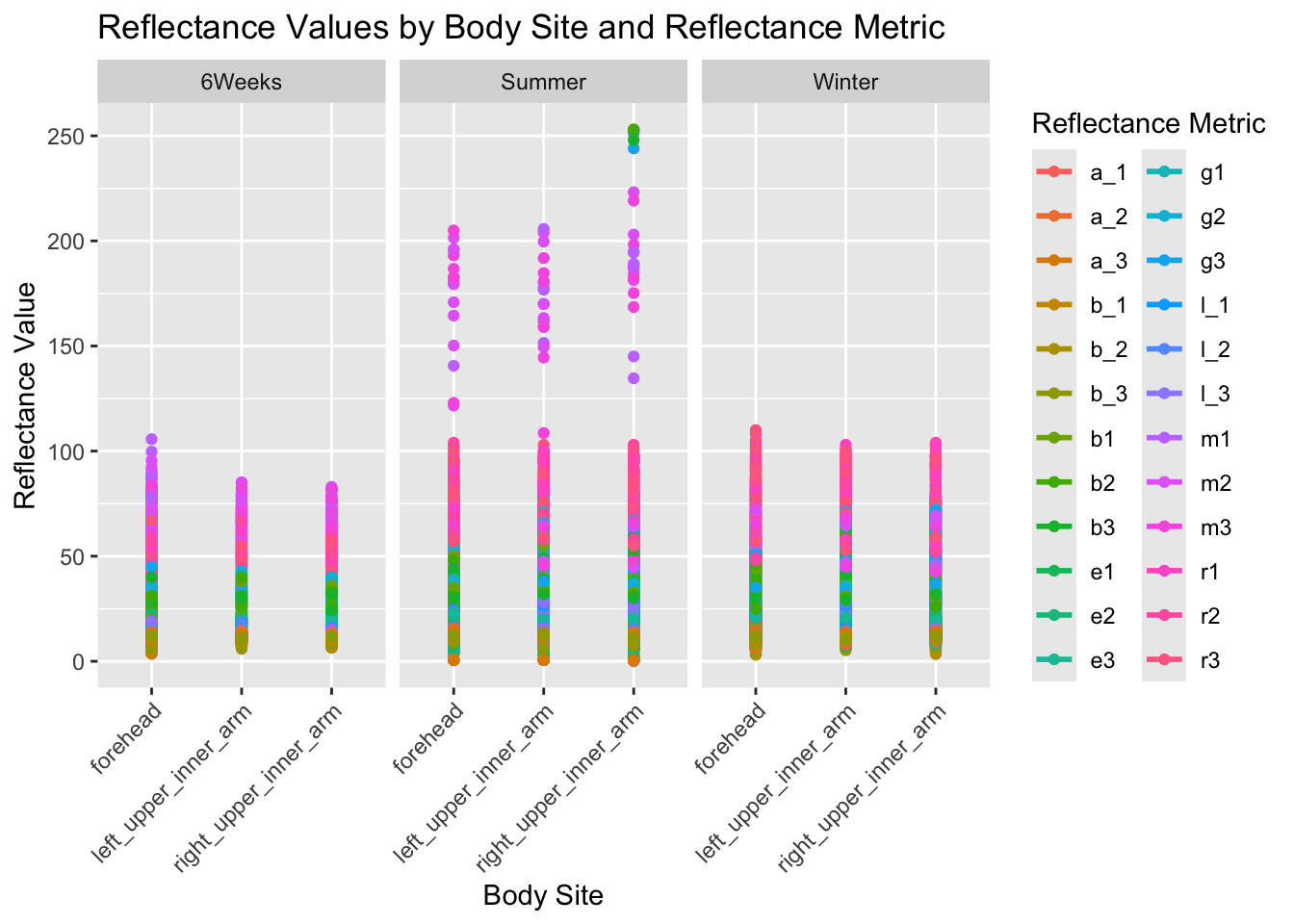 labs(title = "Reflectance Values by Body Site and Reflectance Metric",