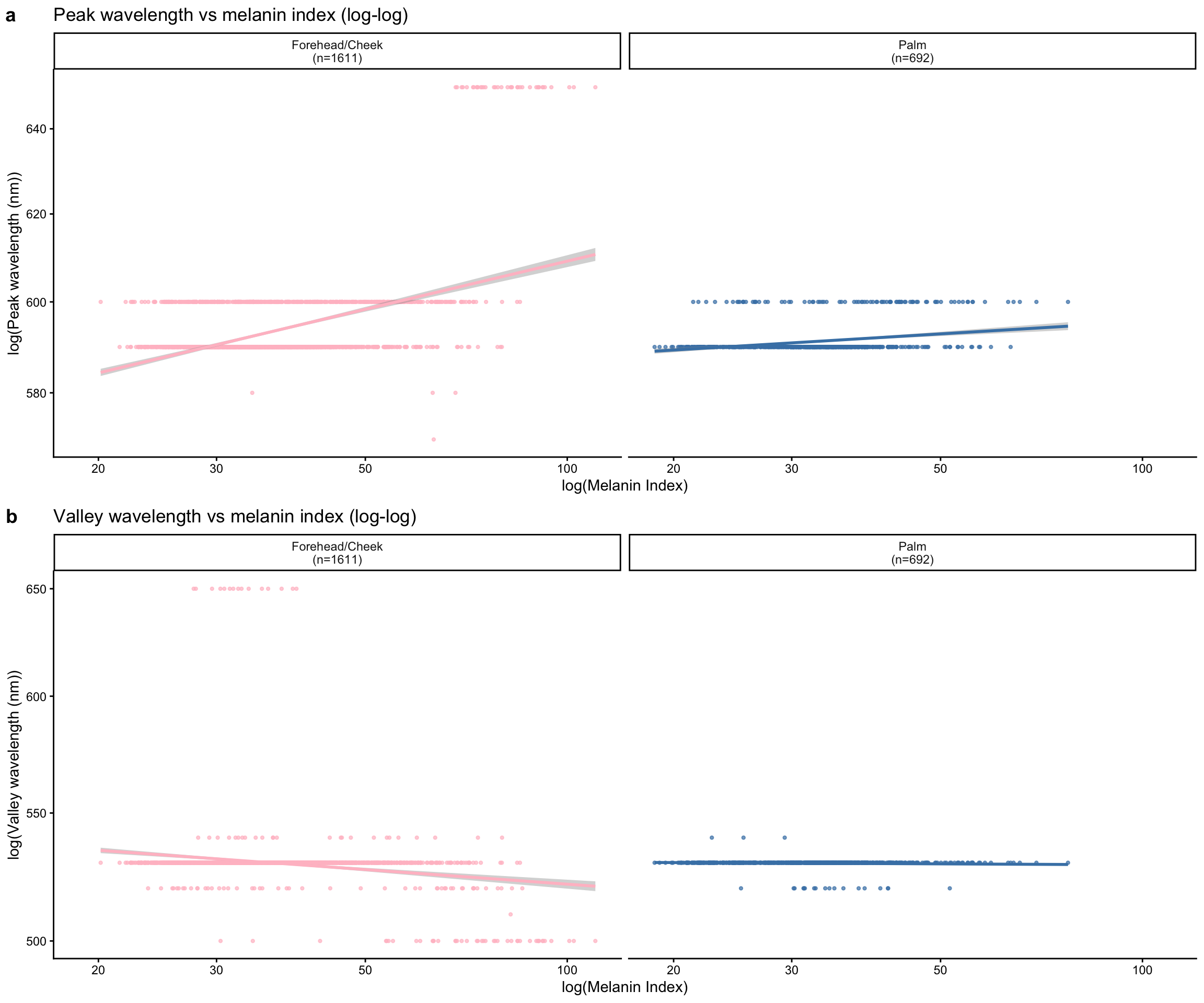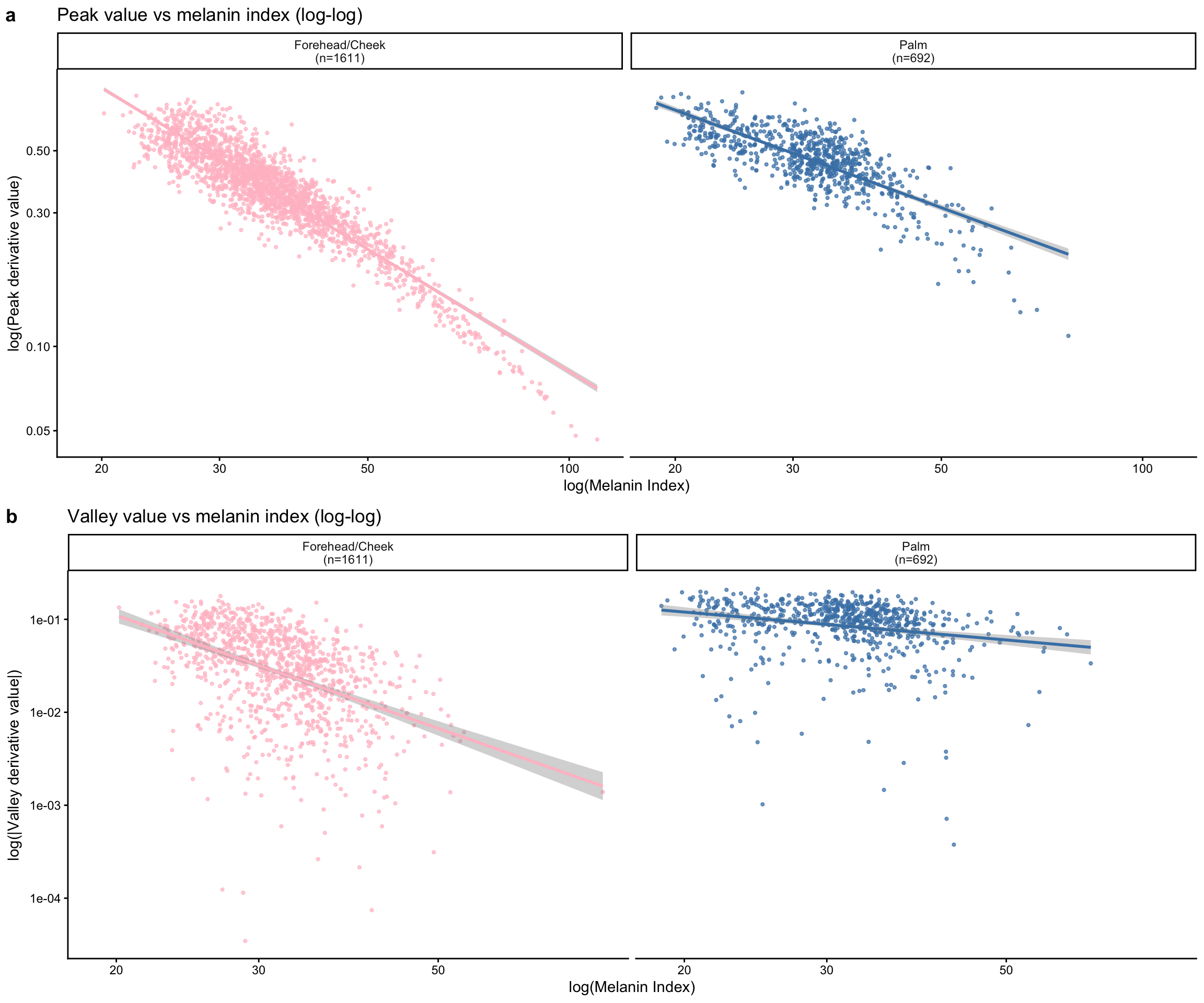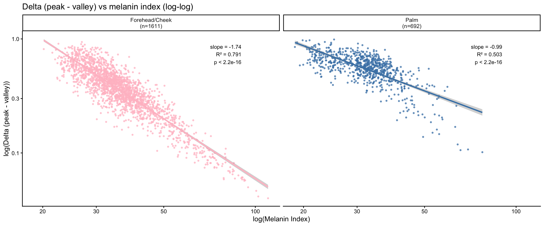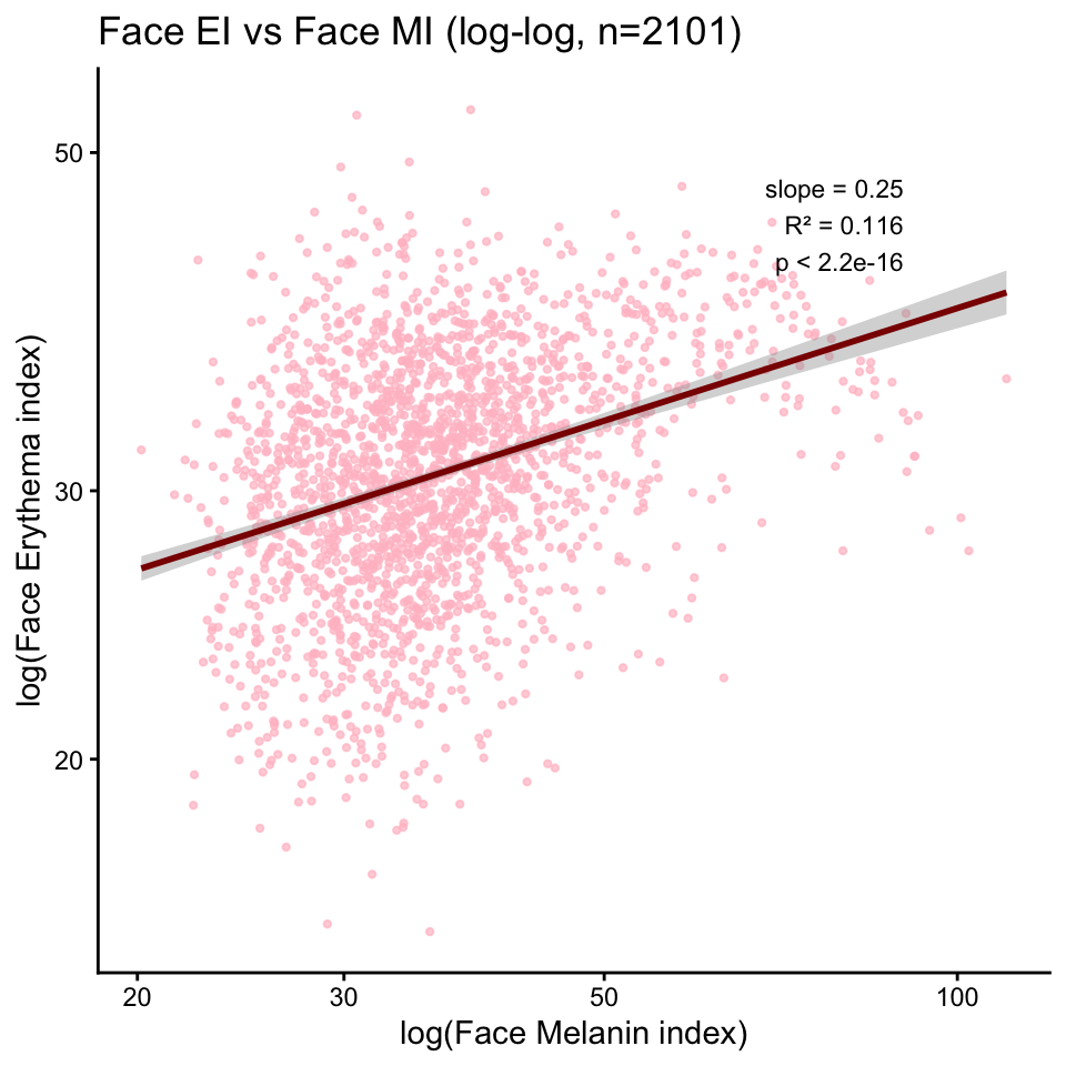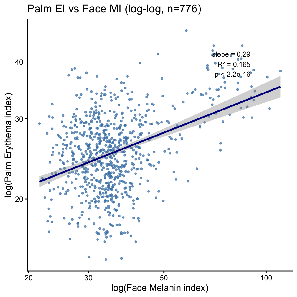 Log-log regression tests whether palm erythema index follows a power-law relationship with face melanin content. This cross-site comparison may reveal systemic hemoglobin patterns independent of local melanin.