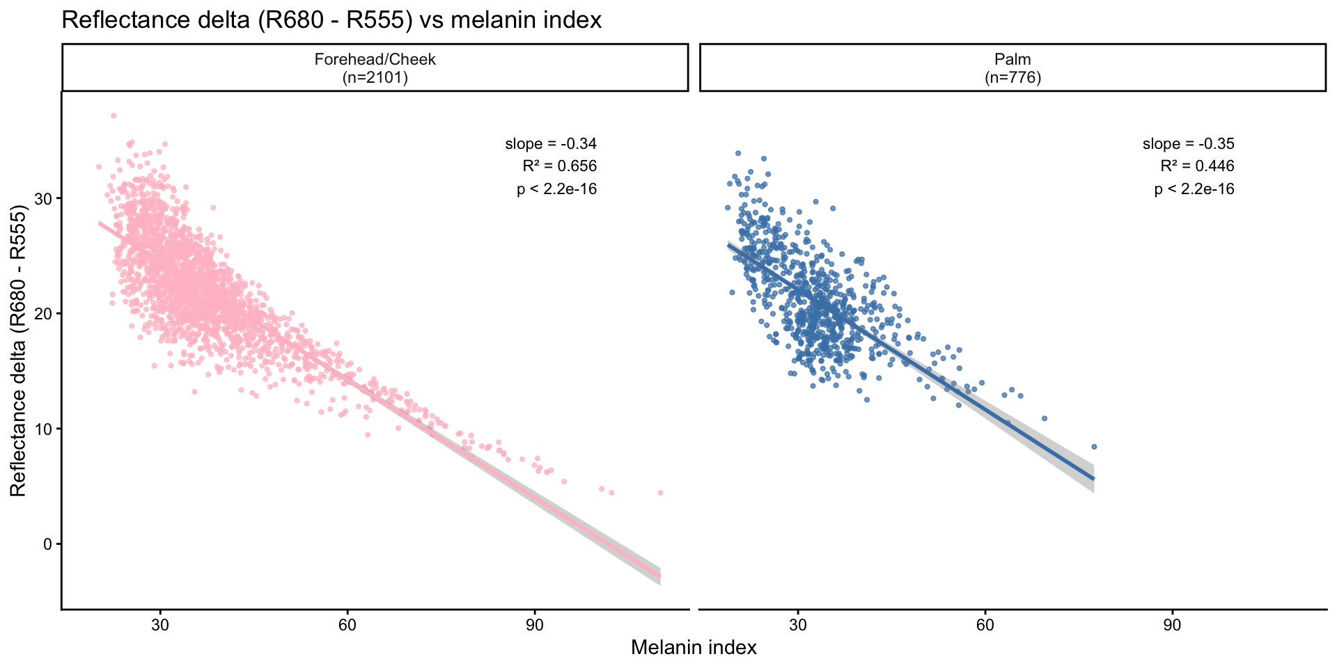 The erythema index is based on the ratio of reflectance at 680 nm to the average reflectance at 550-560 nm (approximating 555 nm). Here we examine the raw reflectance difference (delta) between these wavelengths as a function of melanin index.