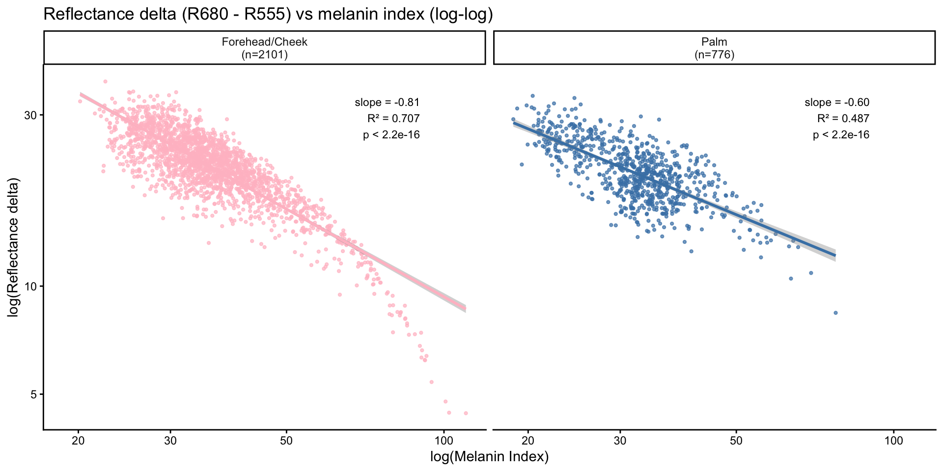 Log-log regression tests whether the reflectance difference between 680 nm and ~555 nm follows a power-law relationship with melanin content. Note: only positive delta values can be log-transformed.