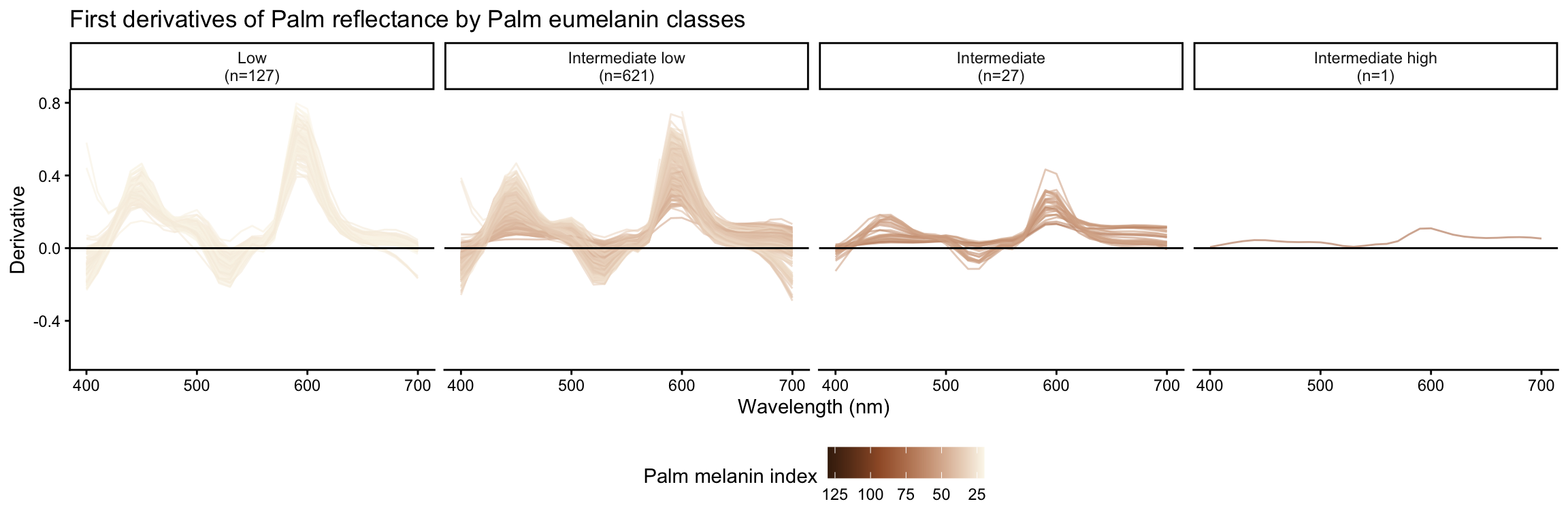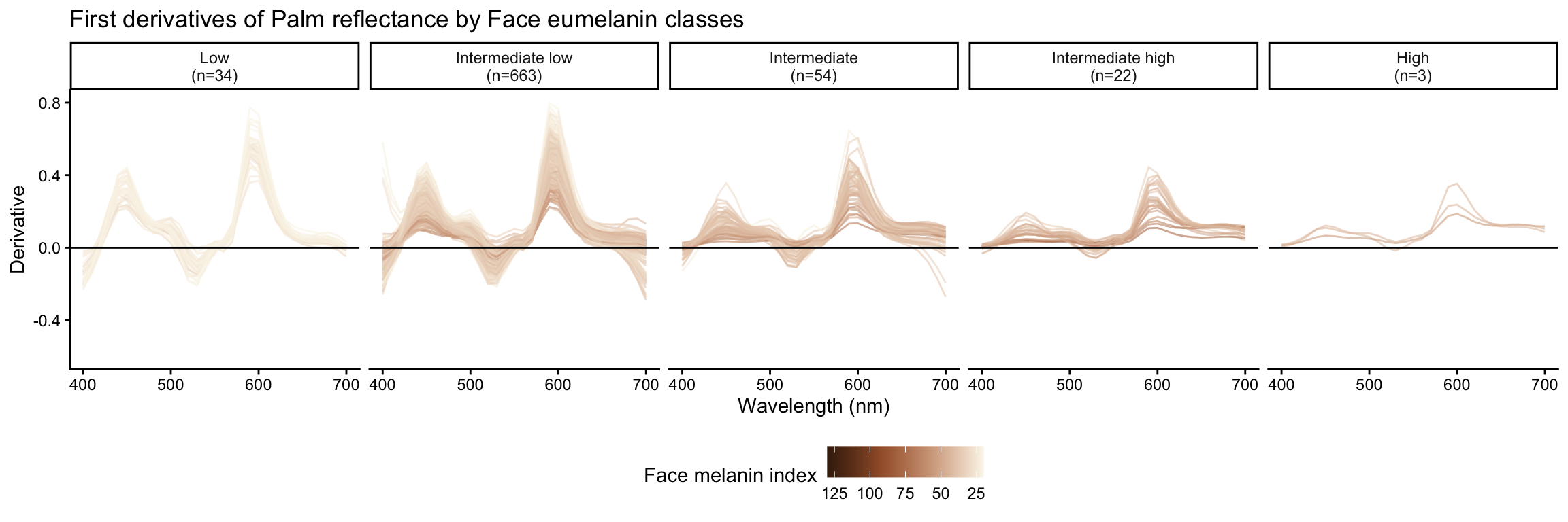 First derivatives of skin spectra are estimated using local polynomial regression with bandwidth selected by the dpill function, scaled by a factor of 0.7.