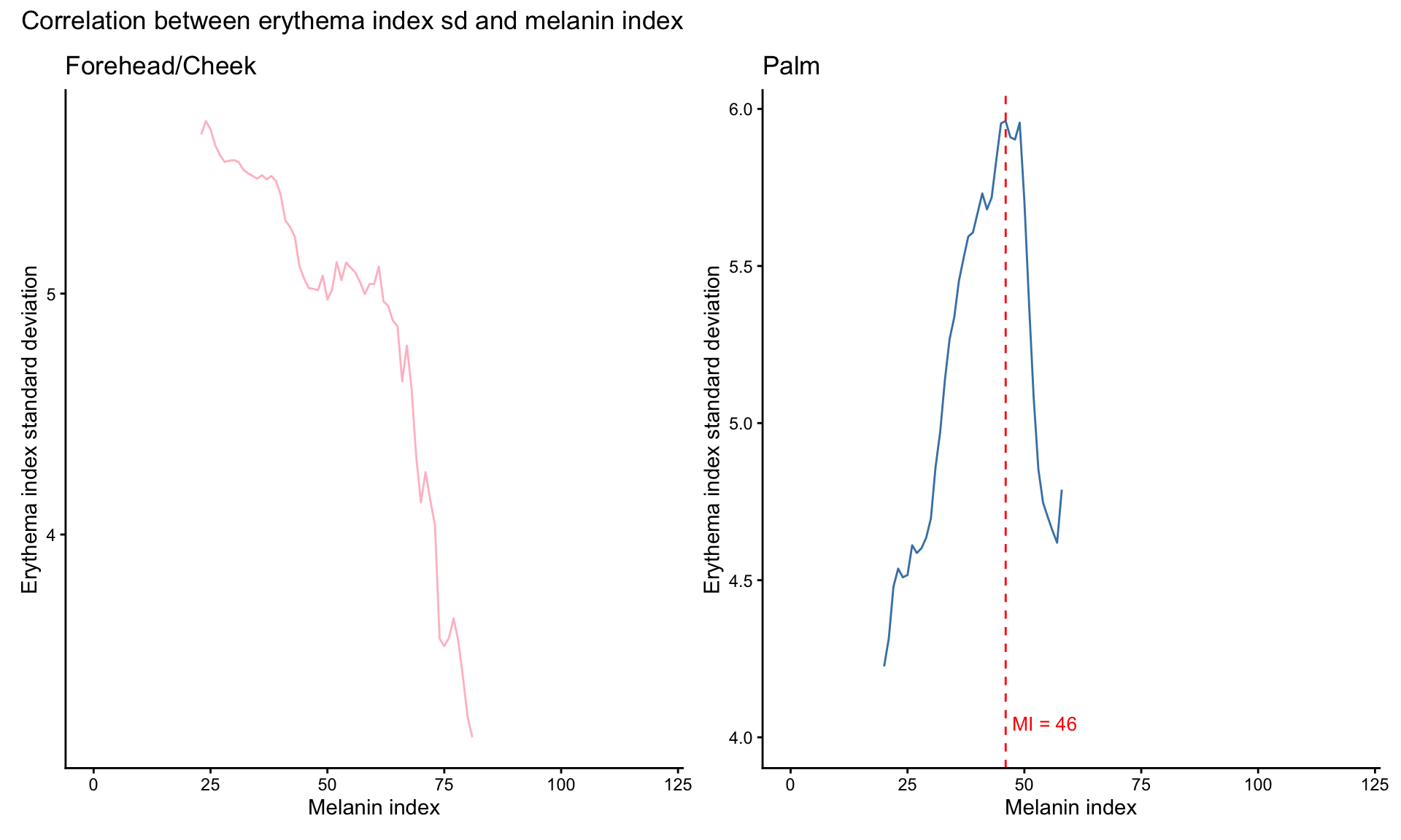 Melanin index (MI) is calculated based on skin reflectance at 680 nm. Specifically, MI = -100 * log10(R680 / 100), where R680 is the reflectance percentage at 680 nm.