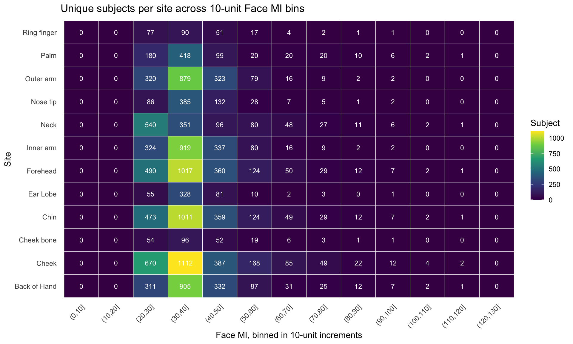 FACE site refers to Forehead or Cheek, while PALM site refers to the Palm of the hand.