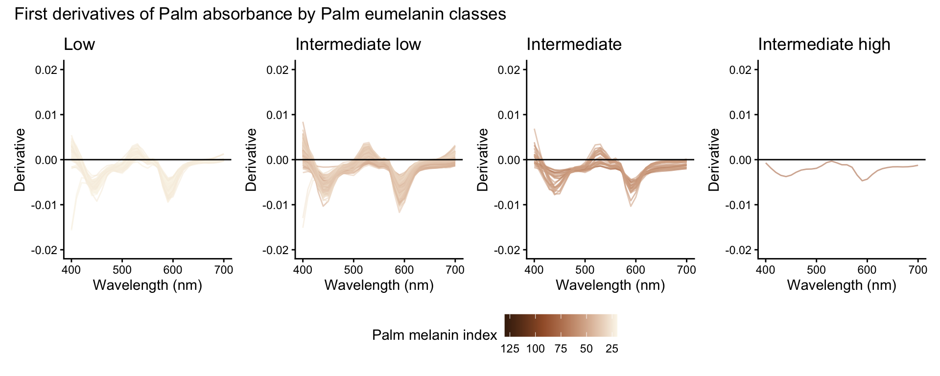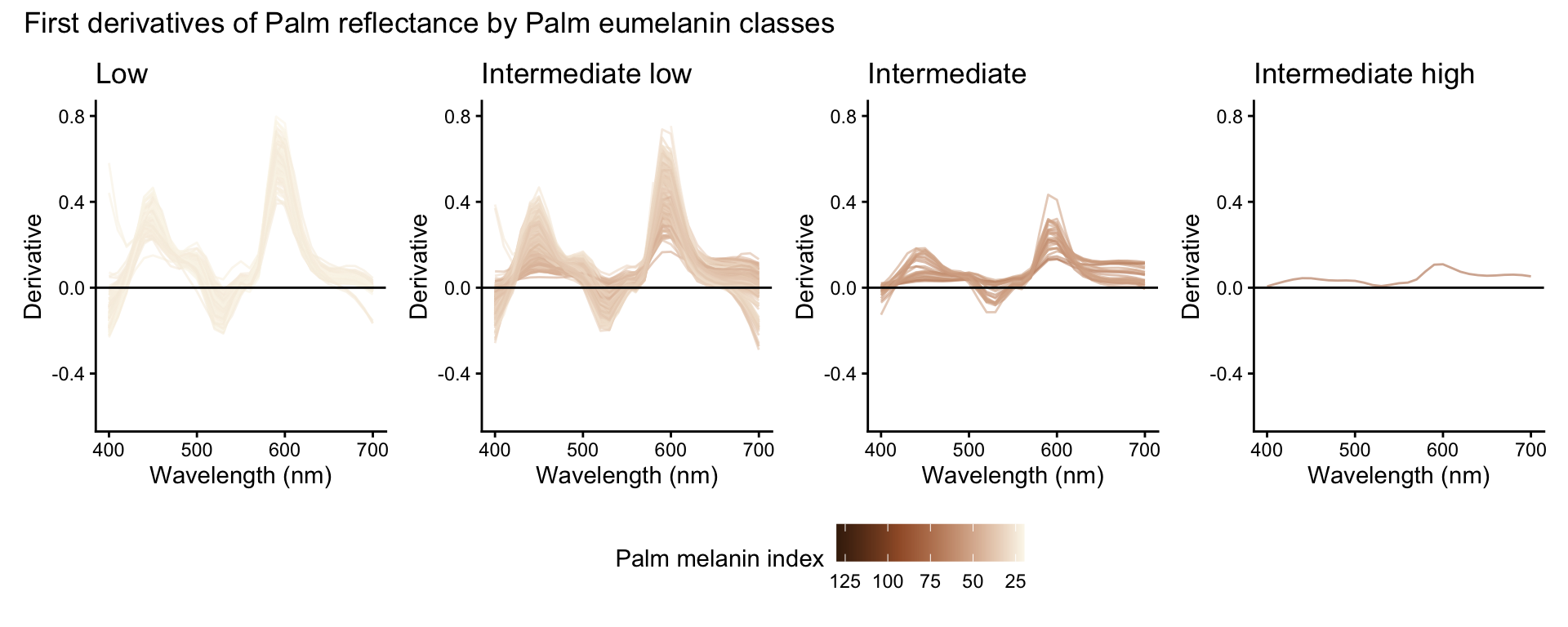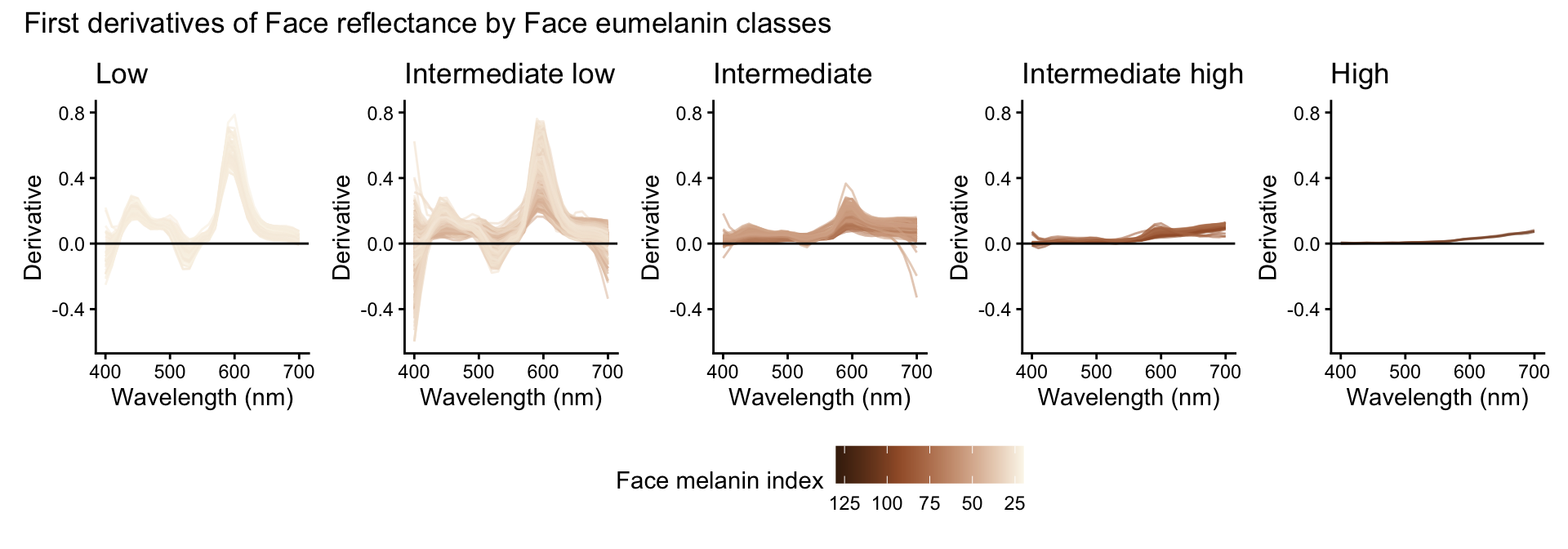 First derivatives of skin spectra are estimated using local polynomial regression with bandwidth selected by the dpill function, scaled by a factor of 0.7.