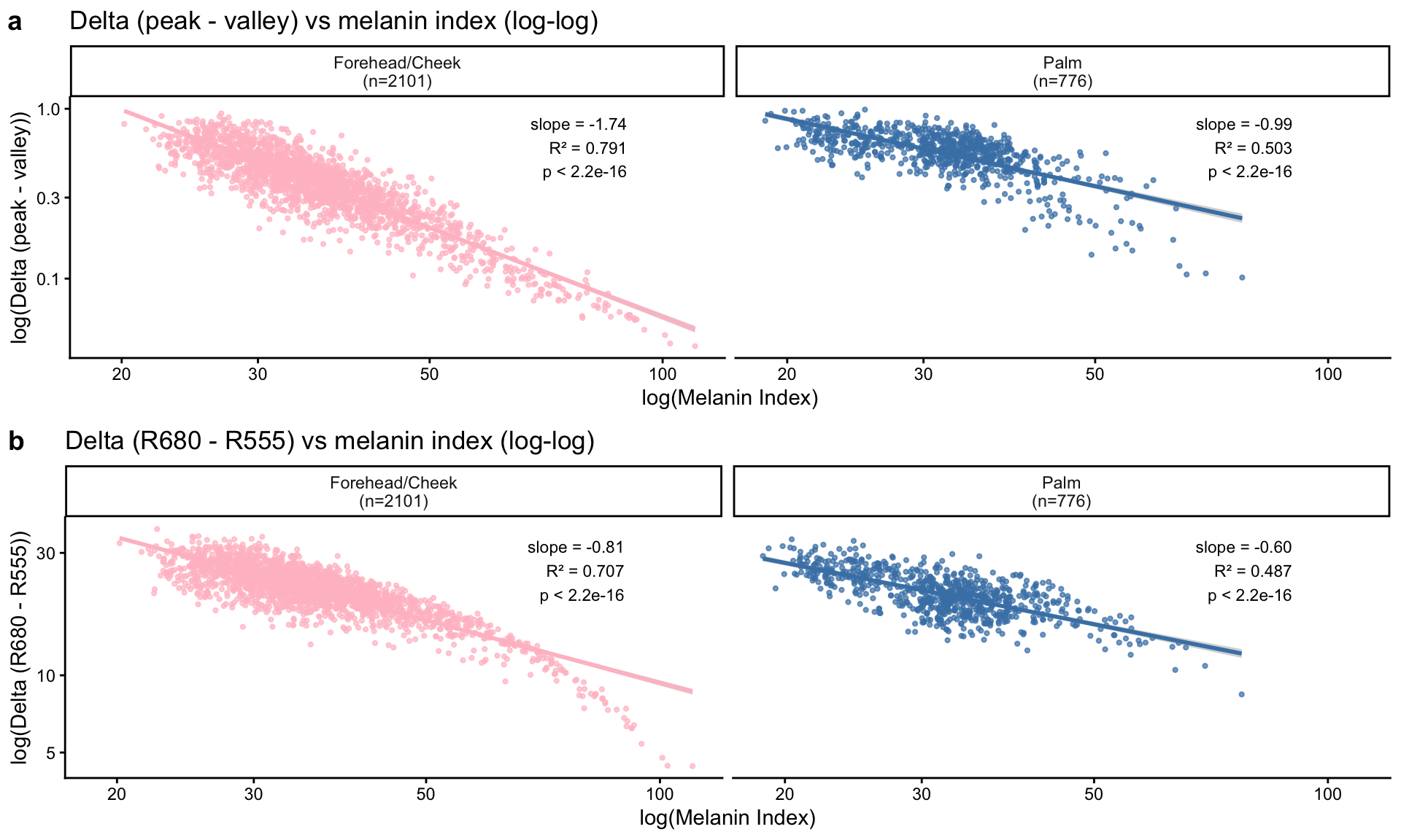 We tested whether anatomical site (forehead/cheek vs palm) modifies the log–log relationship between melanin index (MI) and (i) peak–valley derivative delta and (ii) reflectance delta (R680–R555), using linear mixed-effects models with a random intercept for subject. For each outcome, we compared a main-effects model (log_delta ~ log_mi + bodysite) to an interaction model (log_delta ~ log_mi * bodysite). A significant likelihood ratio test (LRT) indicates site-specific scaling (different slopes).