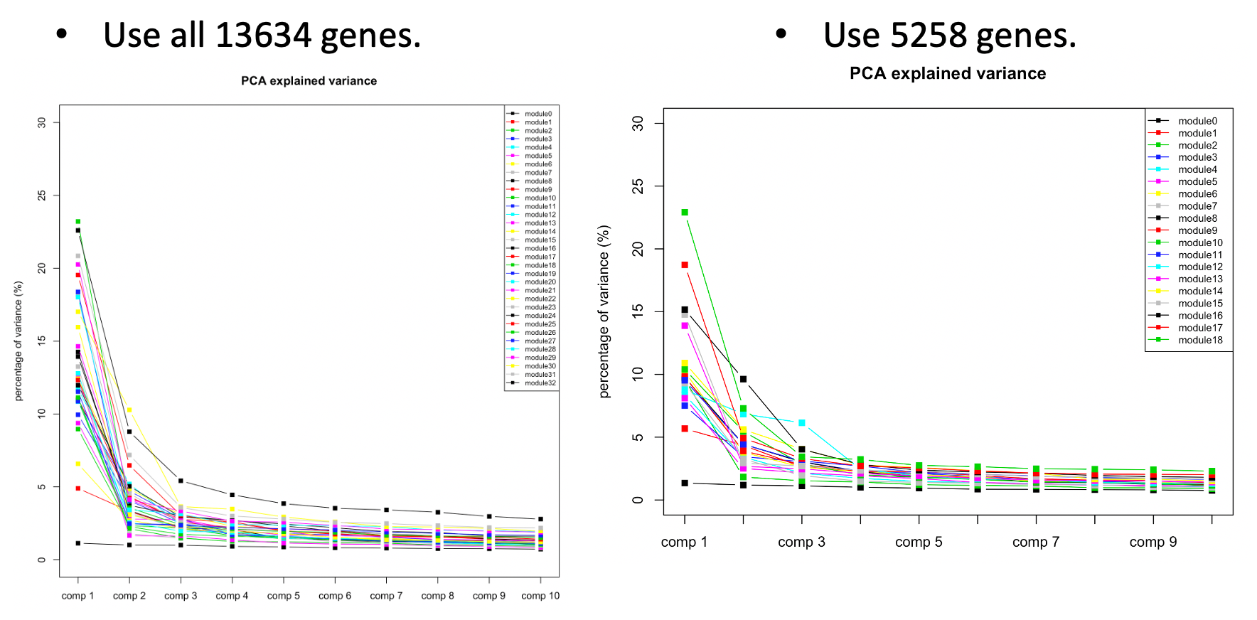 The above plots used all 13634 genes without removing any poorly mapped genes. Next, I removed the poorly mapped genes, with 5258 genes left. I used 30 to cluster these 5258 genes and resulted in 18 modules. We then looked at the explained variance and found nothing seemed wrong. So we decided to use 30 for WGCNA and these 18 modules for downstream analysis.