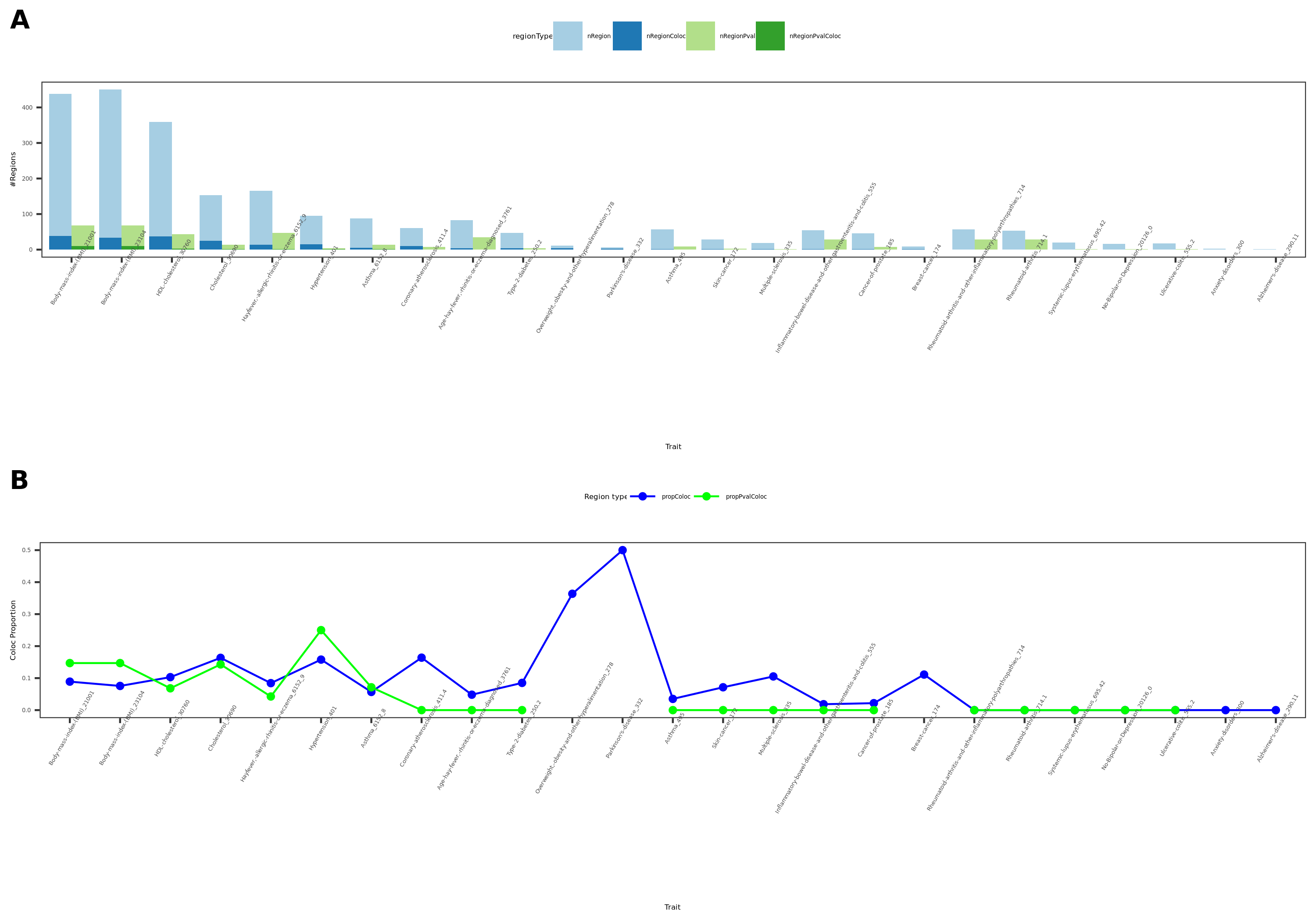 In total, we considered three (four) types of coloc. Coloc with (1) 29 blood related traits from ukbb, (2) 11 immune traits, (3) 27 more traits from ukbb. (The 4-th type is coloc with cis genes.)