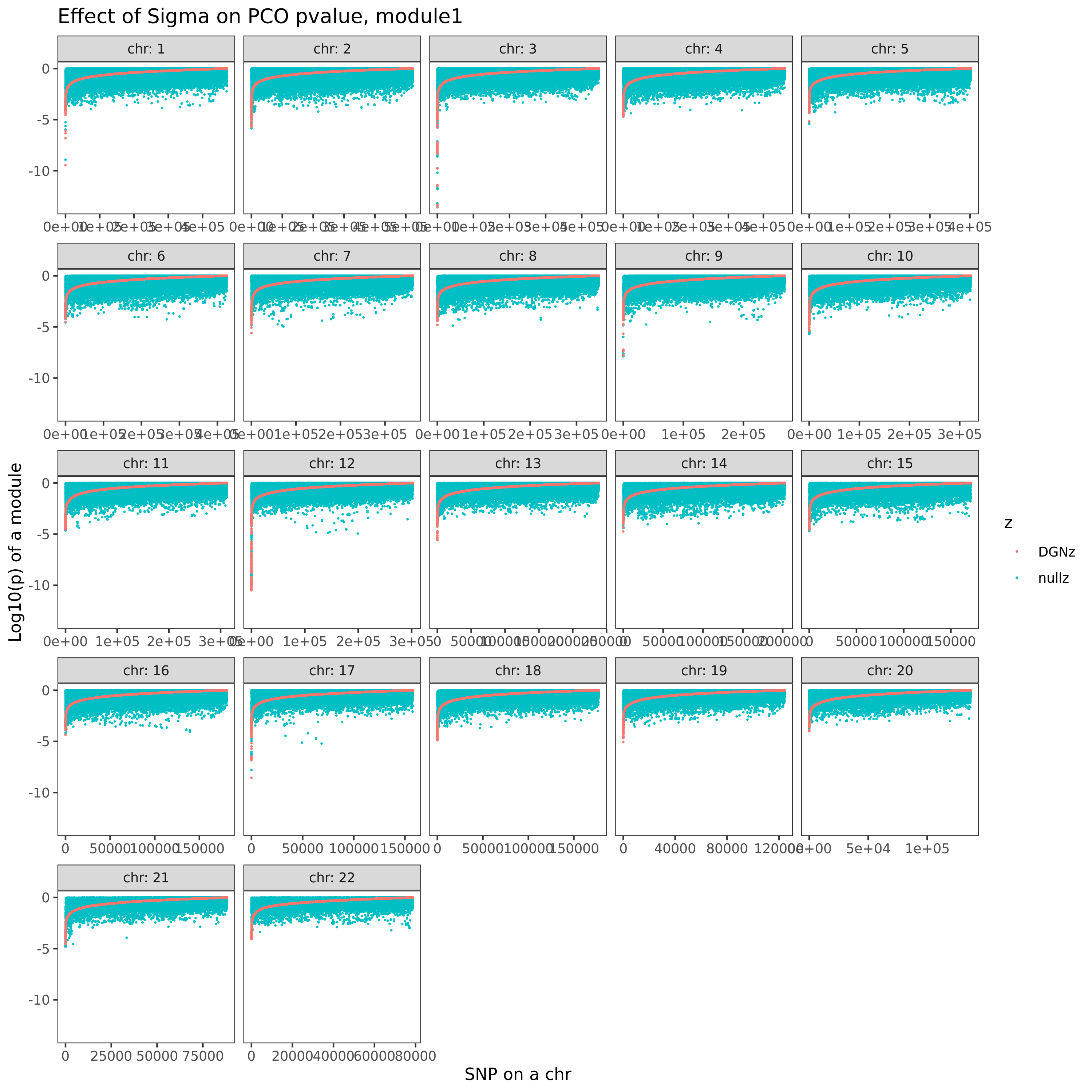 Here I explain the above figure. x-axis is for each module (75), y-axis is for number of SNPs under various scenarios that can be used for computing \(\hat{\Sigma}_{nullz}\). Color is for various z-scores cutoff for defining “NULL SNPs”. The cutoff is pvalue of z. Smaller cutoff, more insignificant z. Point shape is for unique SNPs and independent SNPs. The barplot in the lower panel gives the number of genes in each module.