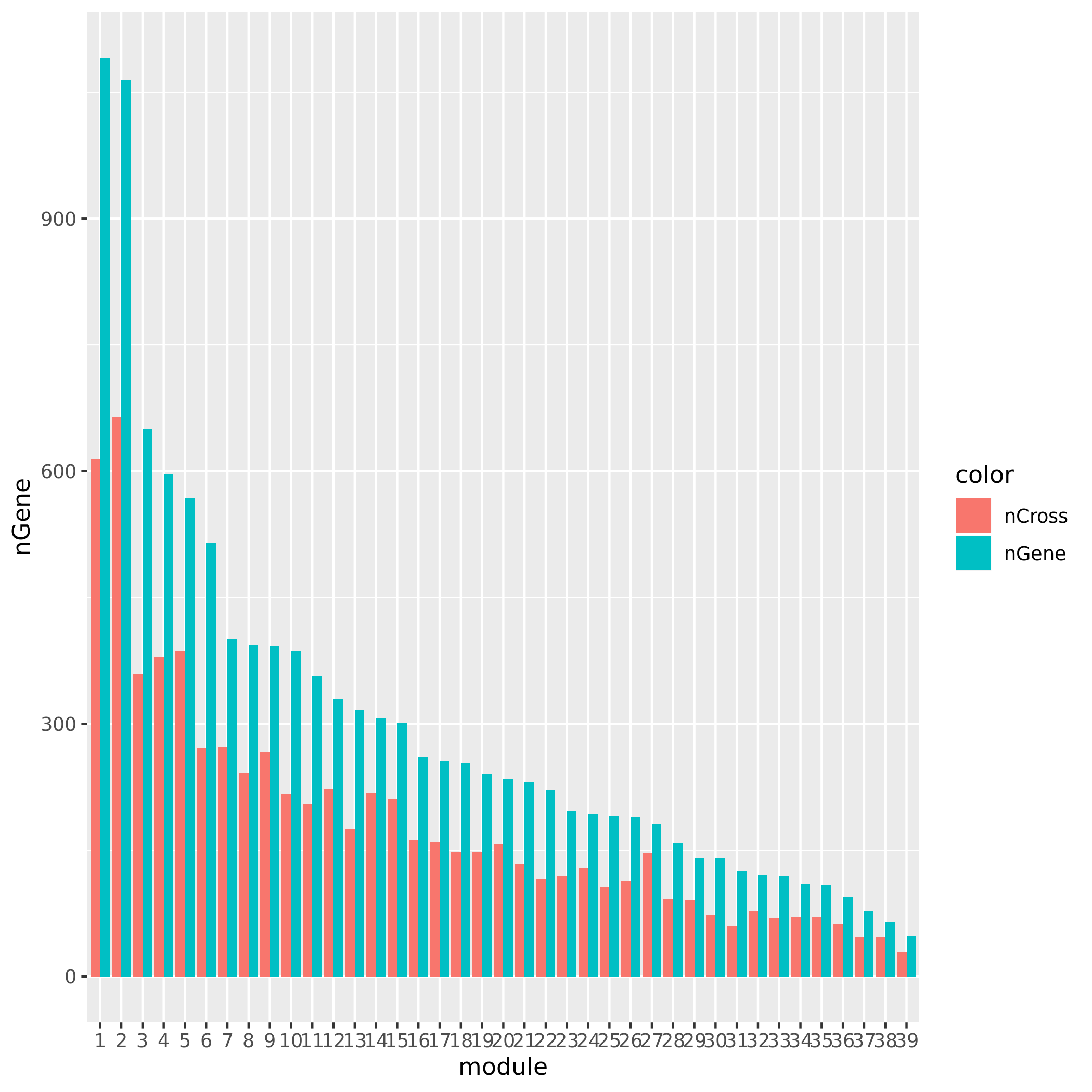 Figure. Module v.s. #Genes. Bar height for module size. Red/blue bar for #cross mappable genes for each module. Left for genes cross mappable with any genes. Right for genes cross mappable with genes within the same module.