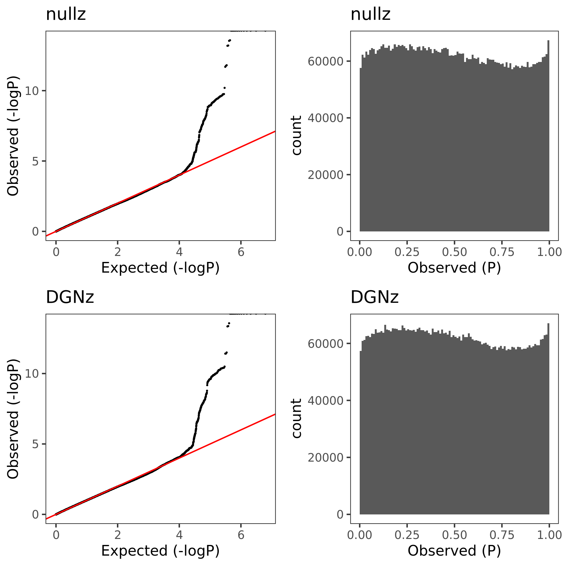 using qvalue for FDR correction (threshold \(0.05\)) and row 2 using \(\frac{0.05}{\#DGN signals}\) as