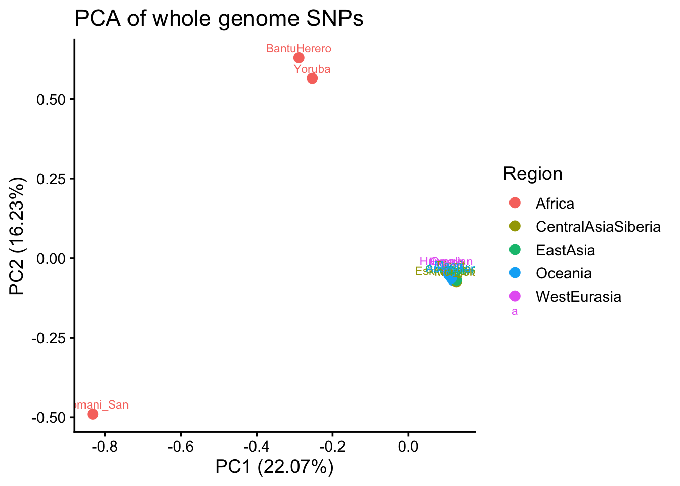title = "PCA of whole genome SNPs",