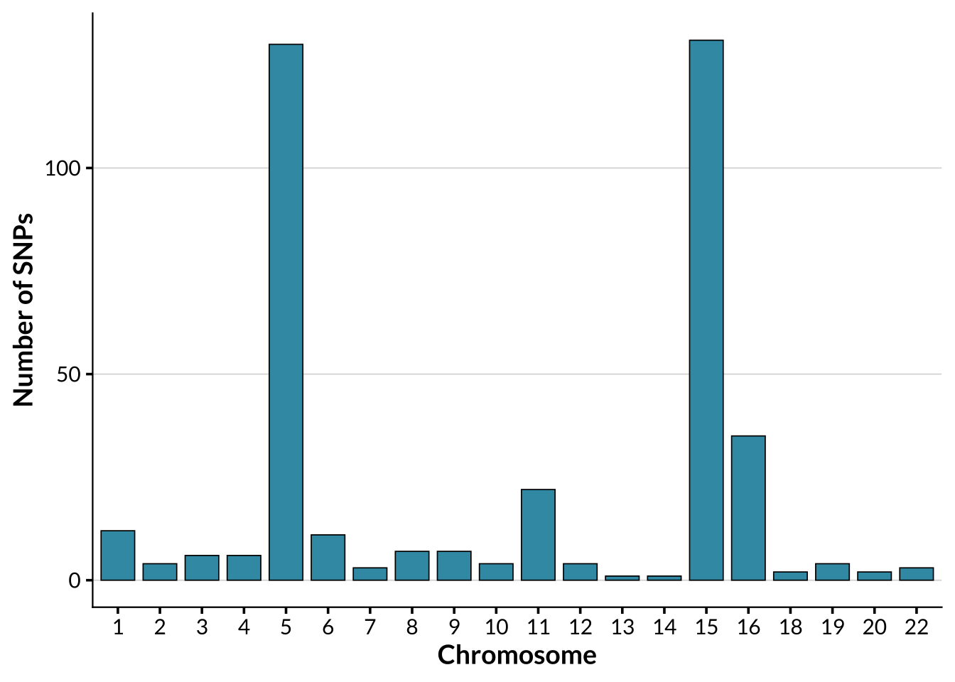 In order to allow for comparison of genome-wide ancestry patterns with structure driven by a targeted functional SNP set. For pigmentation-specific analyses, a panel consisting of 395 SNPs previously associated with pigmentation phenotypes published on the NHGRI-EBI Catalog of human genome-wide association studies was used. The by-chromosome distribution of these SNPs is shown below.