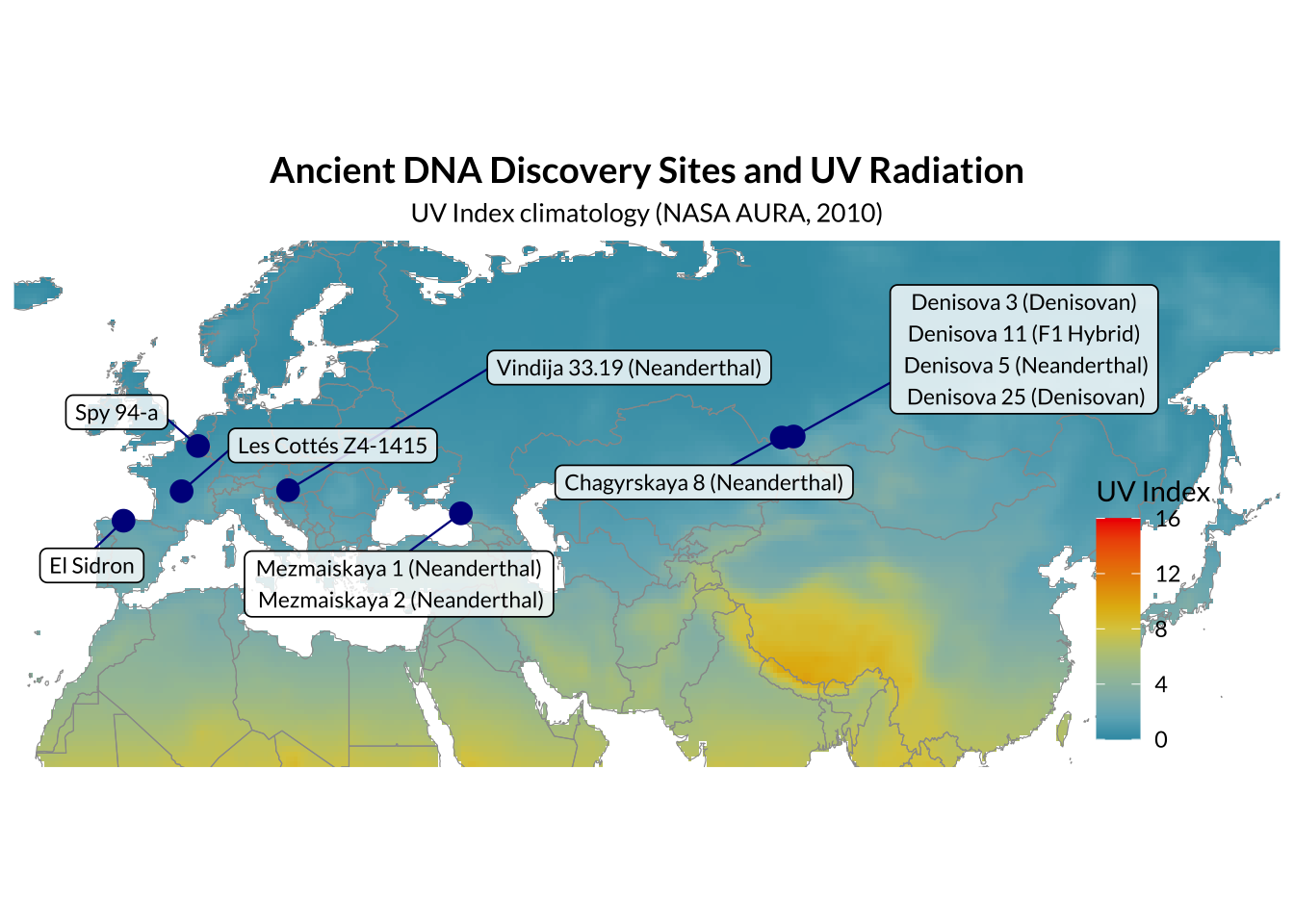 title = "Ancient DNA Discovery Sites and UV Radiation",