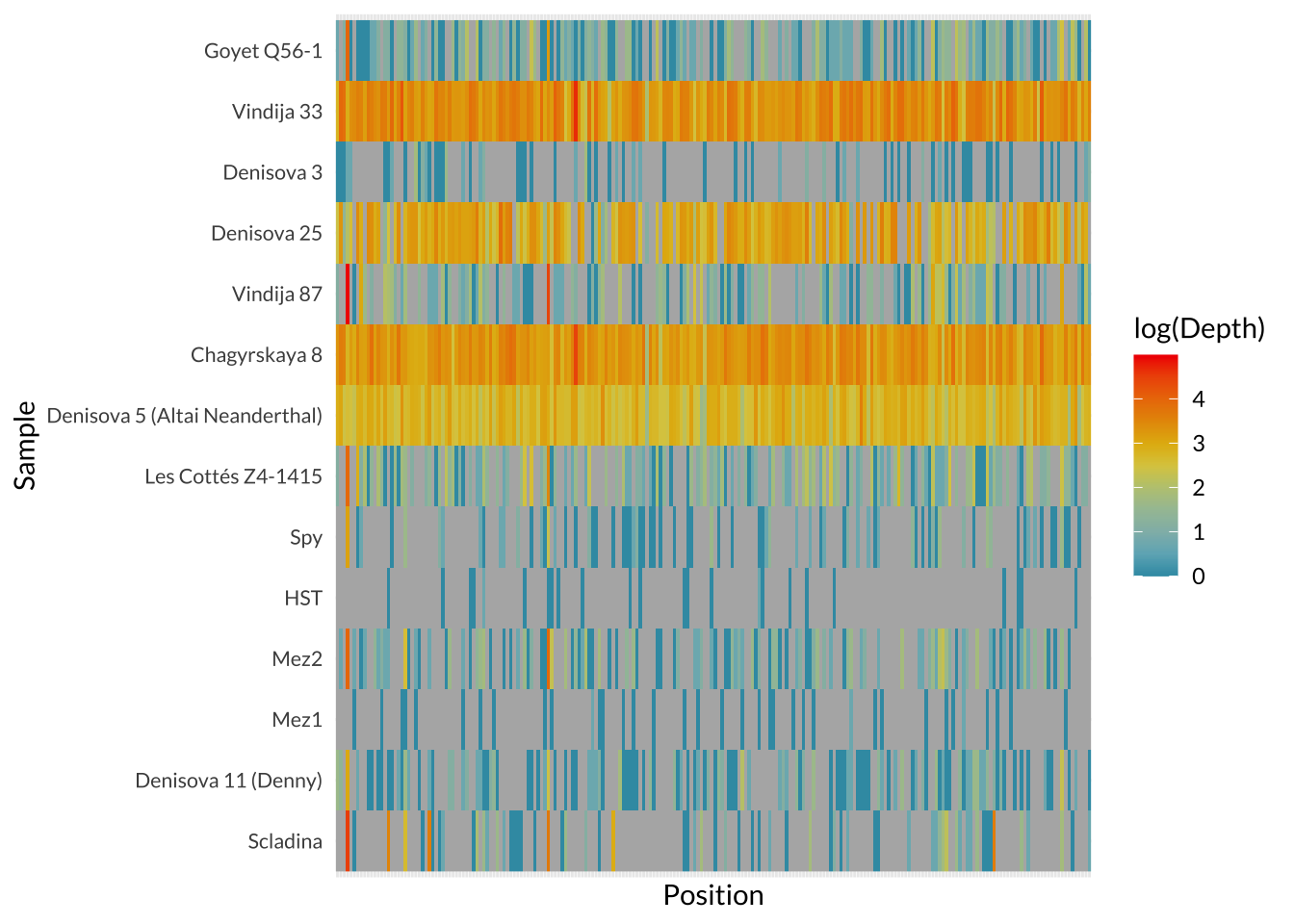 ggplot(depth_all, aes(x = Position, y = Sample)) +