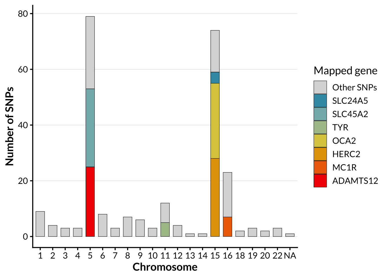 In order to allow for comparison of genome-wide ancestry patterns with structure driven by a targeted functional SNP set. For pigmentation-specific analyses, a panel consisting of 395 SNPs previously associated with pigmentation phenotypes published on the NHGRI-EBI Catalog of human genome-wide association studies was used. The by-chromosome distribution of these SNPs is shown below.