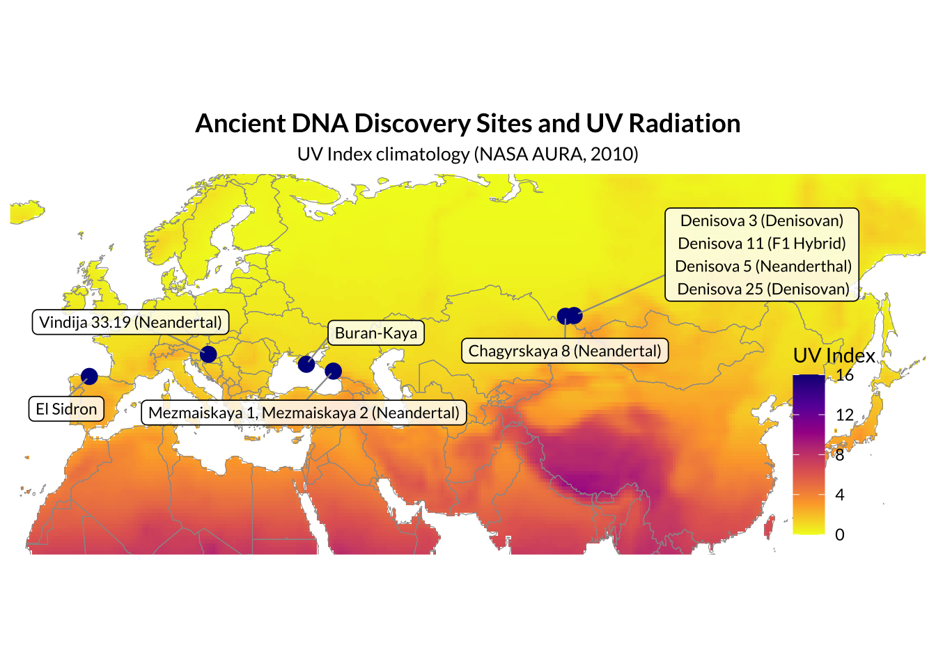 title = "Ancient DNA Discovery Sites and UV Radiation",