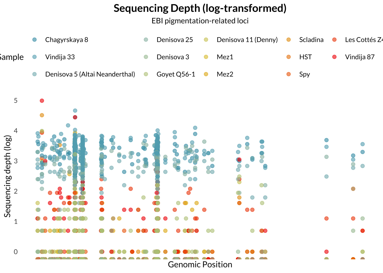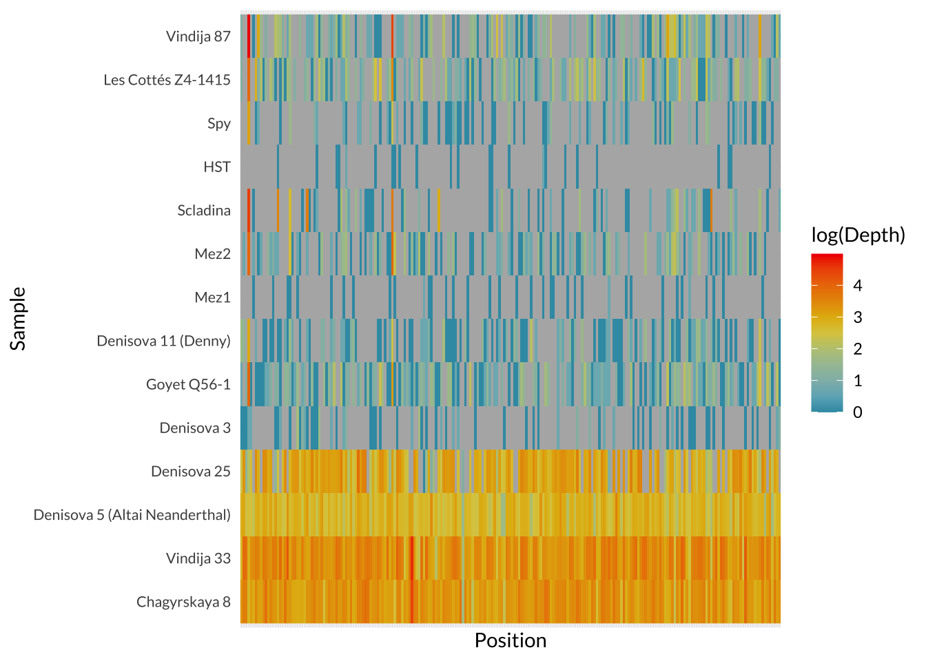 Taken together, these genomes make direct archaic pigmentation analyses possible, but only in the manner of descriptions and comparisons. This limited dataset does not provide enough statistical power to make claims about the full pigmentation range of Neanderthals or Denisovans as groups. This motivates the aim of this study to provide a locus-level catalog of pigmentation-associated SNPs in available archaic genomes, and then compare those with variation in diverse modern humans. In order to examine patterns of missingness, I created a heatmap of where sequencing depth = 0.