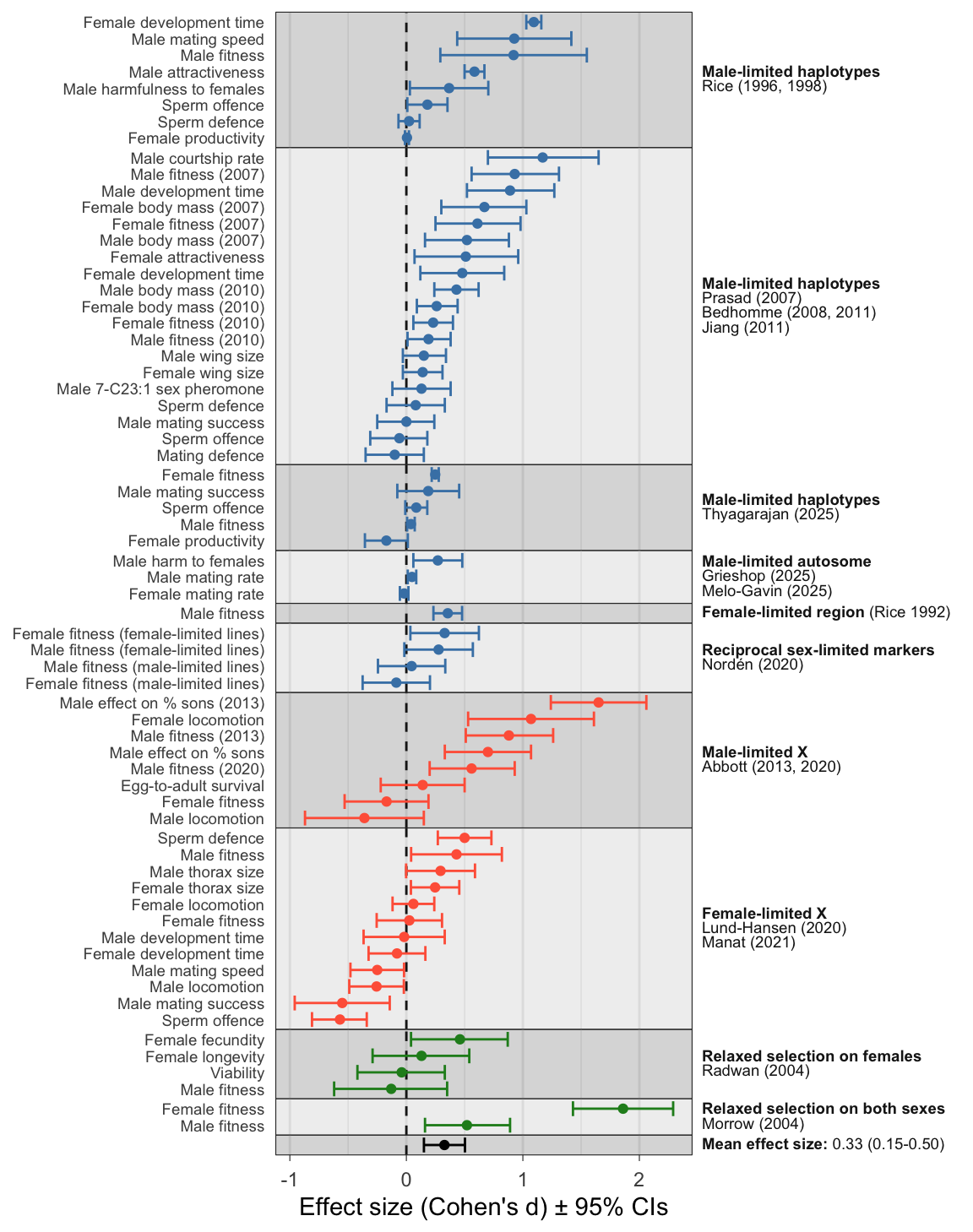 Figure 1: Forest plot showing the estimated effect sizes (Cohen’s d \(\pm\) 95% CIs). The y-axis indicates the trait being measured while horizontal grey bands show the 10 independent experimental evolution projects (projects are measured in one or more publications, named on the right). Positive effect sizes indicate evolutionary change in the direction predicted under IaSC, while negative effects indicate evolution in the opposite direction. Point colour highlights experiments using sex-limited inheritance of autosomal (blue) or X (red) genomic regions, or sex-specific relaxed selection (green). The mean effect size from meta-analysis is shown in black.