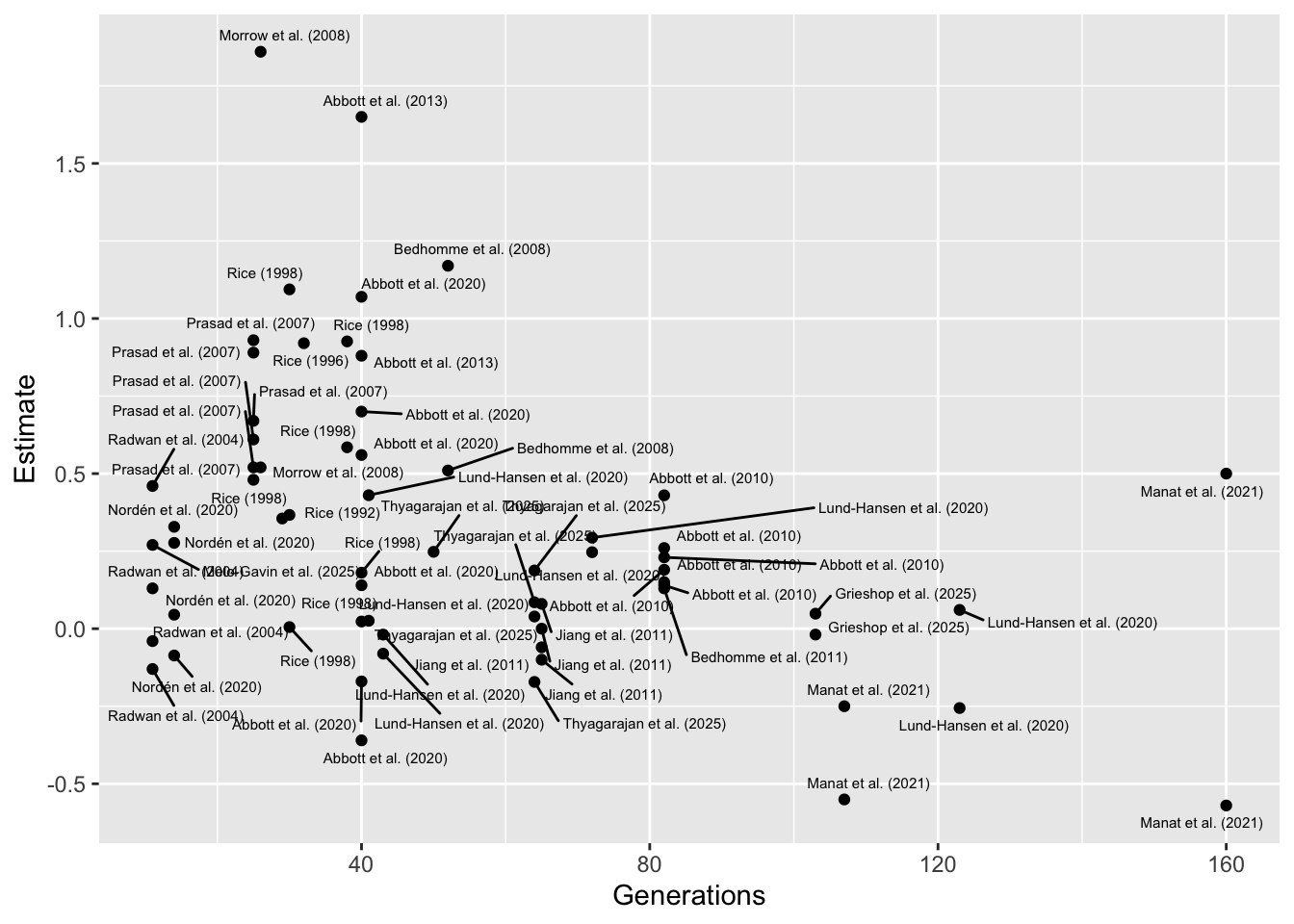 GenerationsOn the right of x-axis (high generation number), this result is driven by a couple of studies, Lund-Hansen et al. (2020) and Manat et al. (2021), which both relate to the same set of experimental evolution lines, and which both focus on female-limited evolution of X chromosomes (uniquely in the full dataset). I also calculated the effect sizes from the raw data for these studies, which avoids falsely inflated the effect sizes (as for some studies where only the overall means were available, incurring pseudoreplication). To the left of the x-axis (short generation number), the trend is driven by a couple of older studies I calculated the effect sizes from overall means, possibly inflating them.