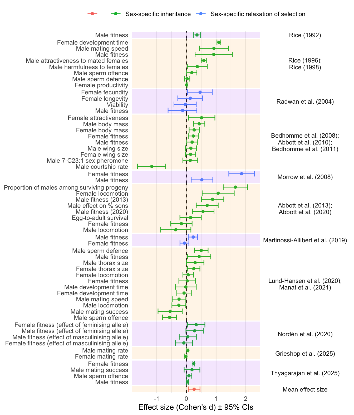 Figure 1: Forest plot showing the estimated effect sizes (Cohen’s d \(\pm\) 95% CIs). The y-axis indicates which trait was measured, and the coloured bands group effect sizes that come from the same set of experimental evolution lines (which are covered in one or more publications, named on the right). Positive effect sizes indicate evolutionary change in the direction predicted under IaSC, while negative effects indicate evolution in the opposite direction. Point colour differentiates between studies that manipulated inheritance vs selection. The grand mean effect size, shown at the bottom, is significantly positive.