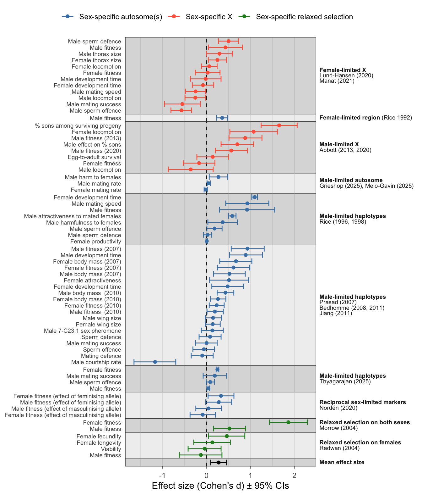 GenerationsOn the right of x-axis (high generation number), this result is driven by a couple of studies, Lund-Hansen et al. (2020) and Manat et al. (2021), which both relate to the same set of experimental evolution lines, and which both focus on female-limited evolution of X chromosomes (uniquely in the full dataset). I also calculated the effect sizes from the raw data for these studies, avoiding issues with falsely inflating them. to the left of the x-axis (short generation number), the trend is driven by a couple of older studies I calculated the effect sizes from summary statistics, possibly inflating them.