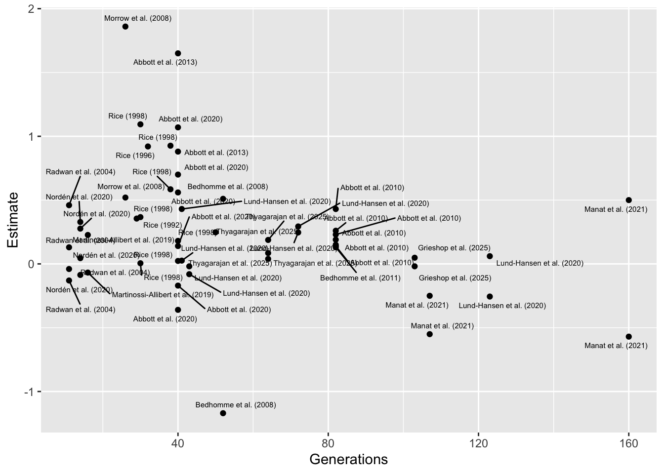 GenerationsOn the right of x-axis (high generation number), this result is driven by a couple of studies, Lund-Hansen et al. (2020) and Manat et al. (2021), which both relate to the same set of experimental evolution lines, and which both focus on female-limited evolution of X chromosomes (uniquely in the full dataset). I also calculated the effect sizes from the raw data for these studies, avoiding issues with falsely inflating them. to the left of the x-axis (short generation number), the trend is driven by a couple of older studies I calculated the effect sizes from summary statistics, possibly inflating them.