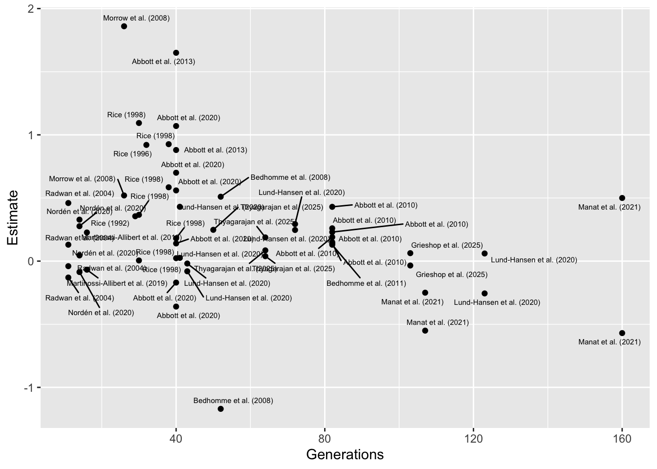 GenerationsOn the right of x-axis (high generation number), this result is driven by a couple of studies, Lund-Hansen et al. (2020) and Manat et al. (2021), which both relate to the same set of experimental evolution lines, and which both focus on female-limited evolution of X chromosomes (uniquely in the full dataset). I also calculated the effect sizes from the raw data for these studies, avoiding issues with falsely inflating them. to the left of the x-axis (short generation number), the trend is driven by a couple of older studies I calculated the effect sizes from summary statistics, possibly inflating them.