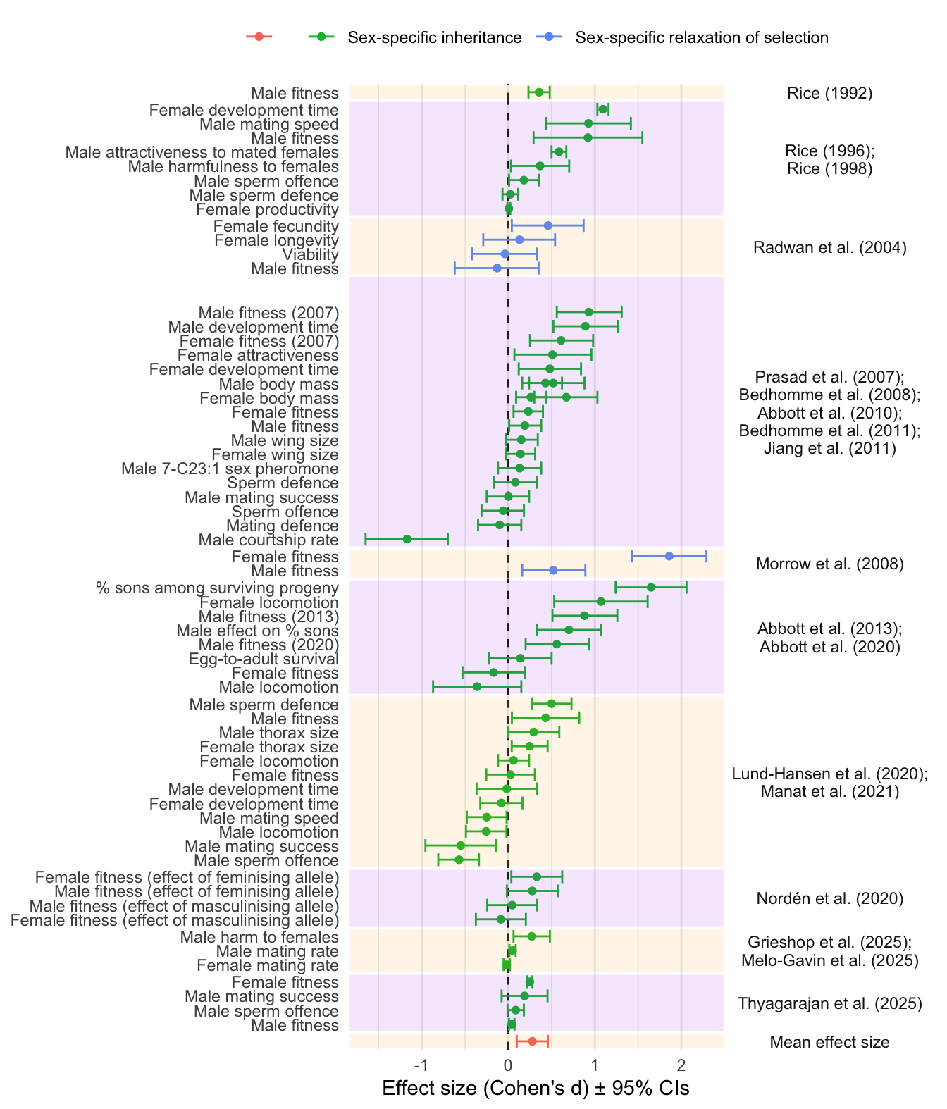 Figure 1: Forest plot showing the estimated effect sizes (Cohen’s d \(\pm\) 95% CIs). The y-axis indicates which trait was measured, and the coloured bands group effect sizes that come from the same set of experimental evolution lines (which are covered in one or more publications, named on the right). Positive effect sizes indicate evolutionary change in the direction predicted under IaSC, while negative effects indicate evolution in the opposite direction. Point colour differentiates between studies that manipulated inheritance vs selection. The grand mean effect size, shown at the bottom, is significantly positive.