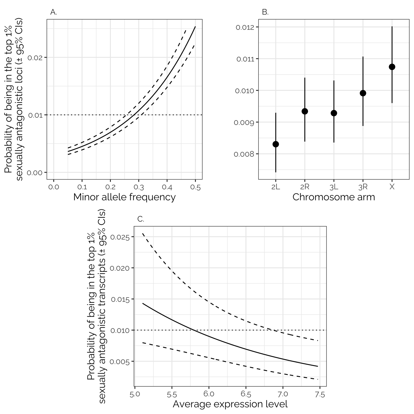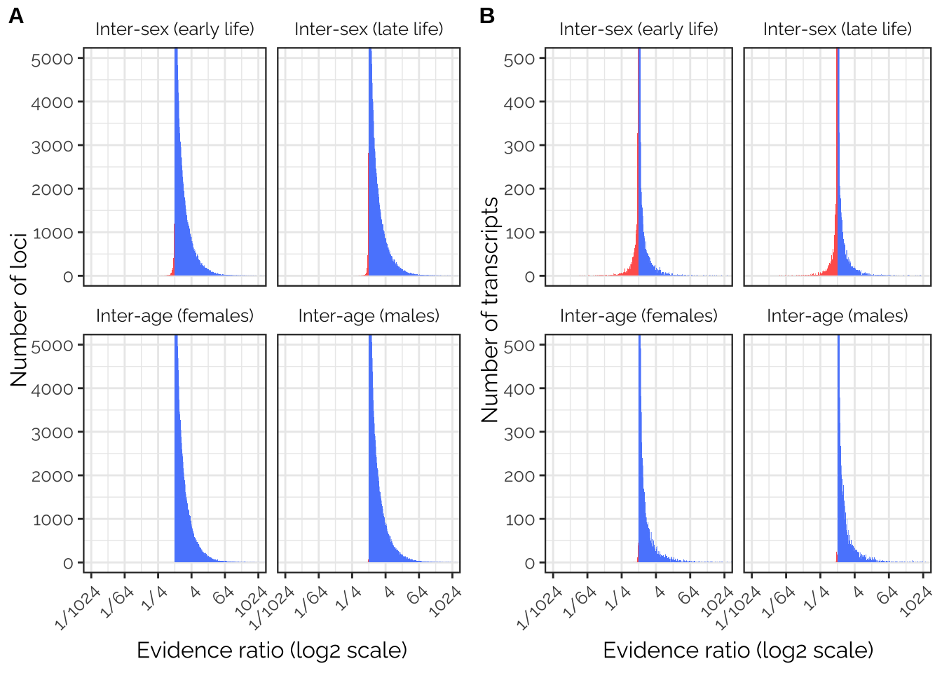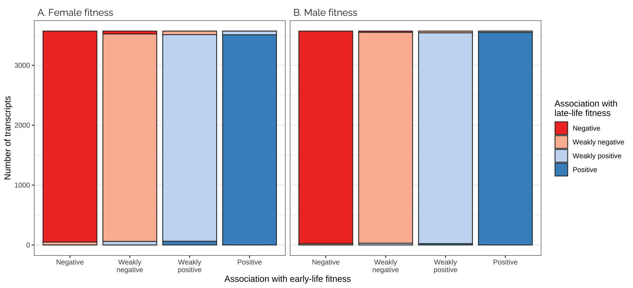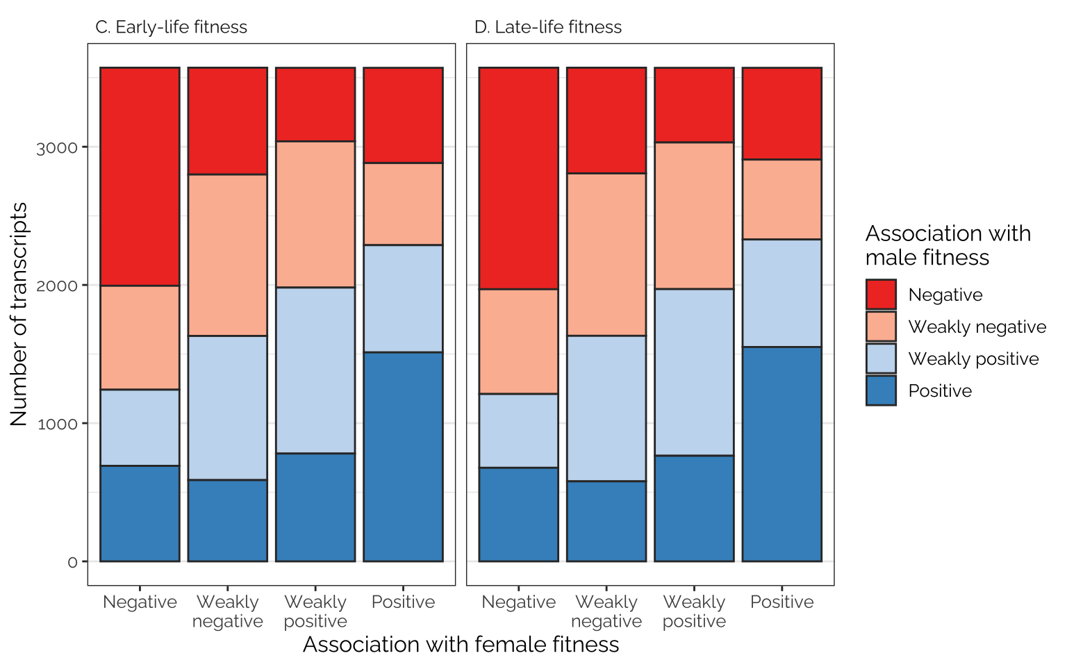Table: The table shows all the GO terms with a family wise error rate (FWER) threshold of FWER < 0.05, when testing for GO enrichment among genes whose transcripts had a high evidence ratio (indicating greater likelihood of being sexually concordant, as measured in the early-life fitness assay). GO terms related to gene expression and translation were enriched, which suggests that there is strong, sexually concordant selection on the expression levels of genes involved in gene expression and translation.