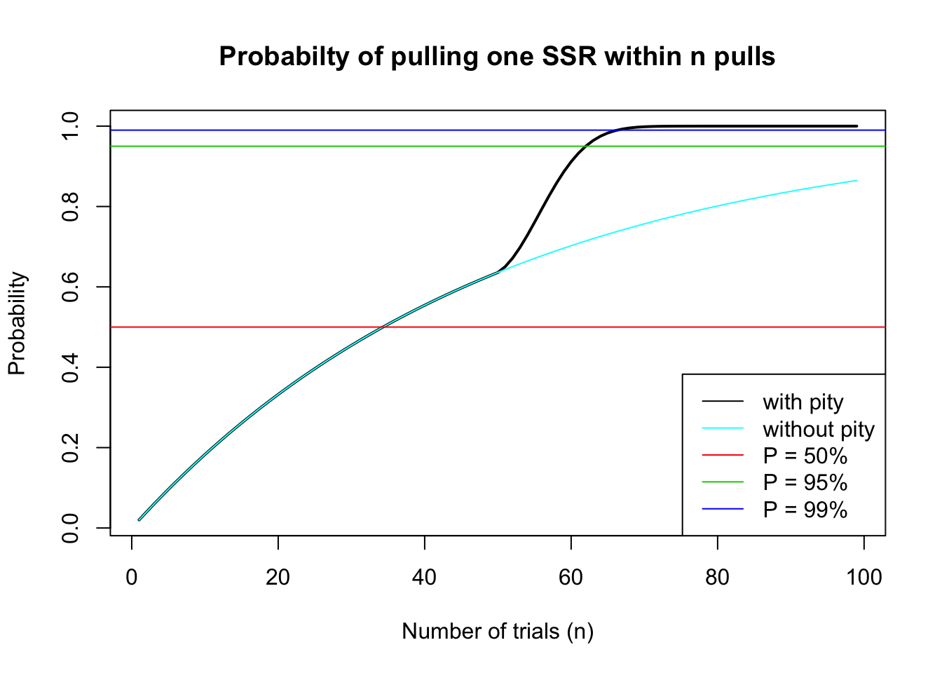 legend('bottomright', legend=c('with pity', 'without pity', 'P = 50%',