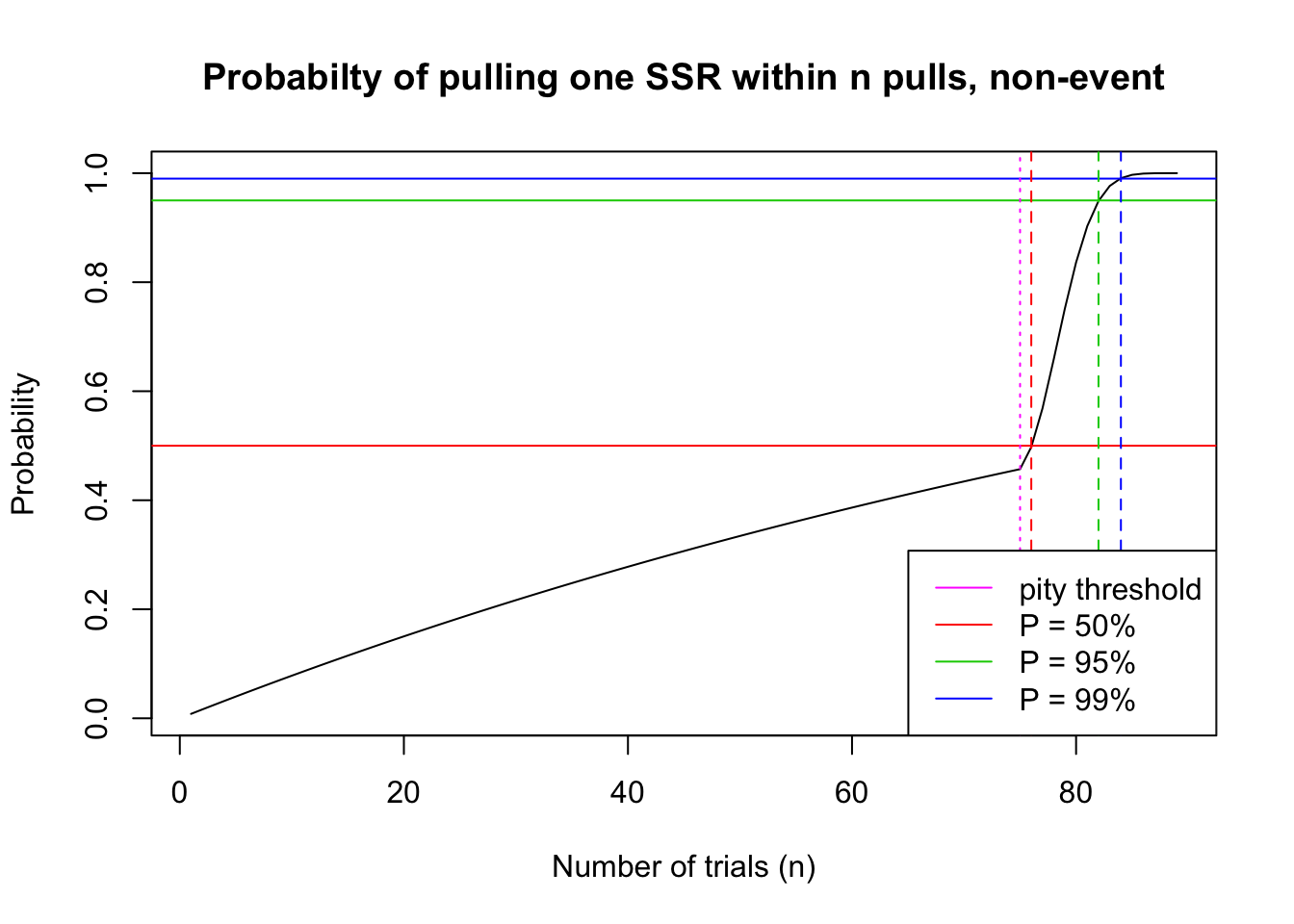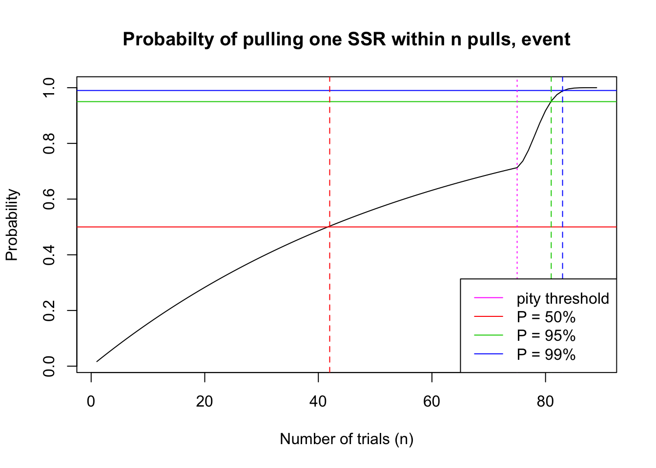 [1] "Player has 99% probability to pull their first SSR within 84 pulls."