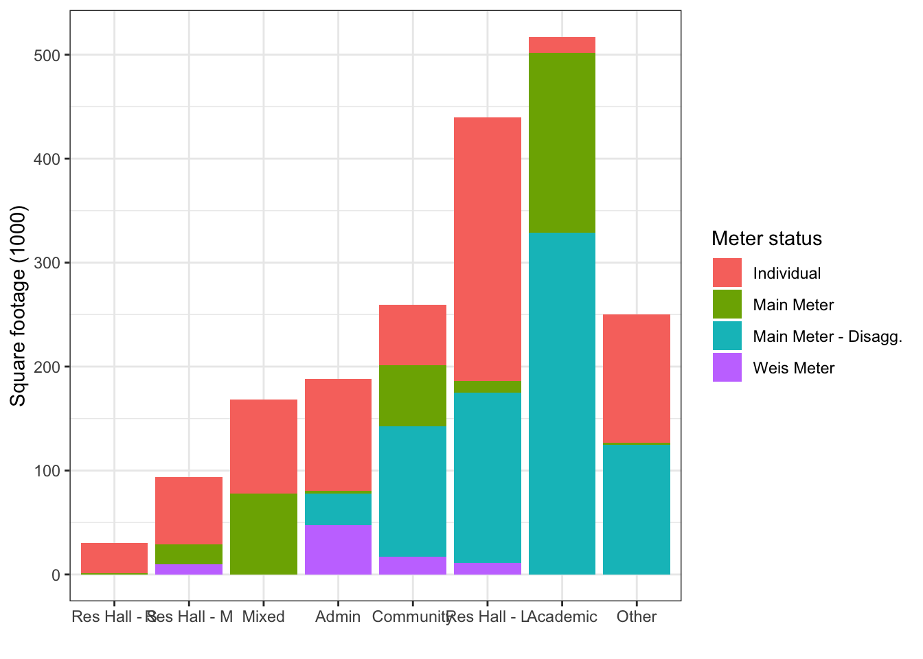 labs(x = "", y = "Square footage (1000)", fill = "Meter status")