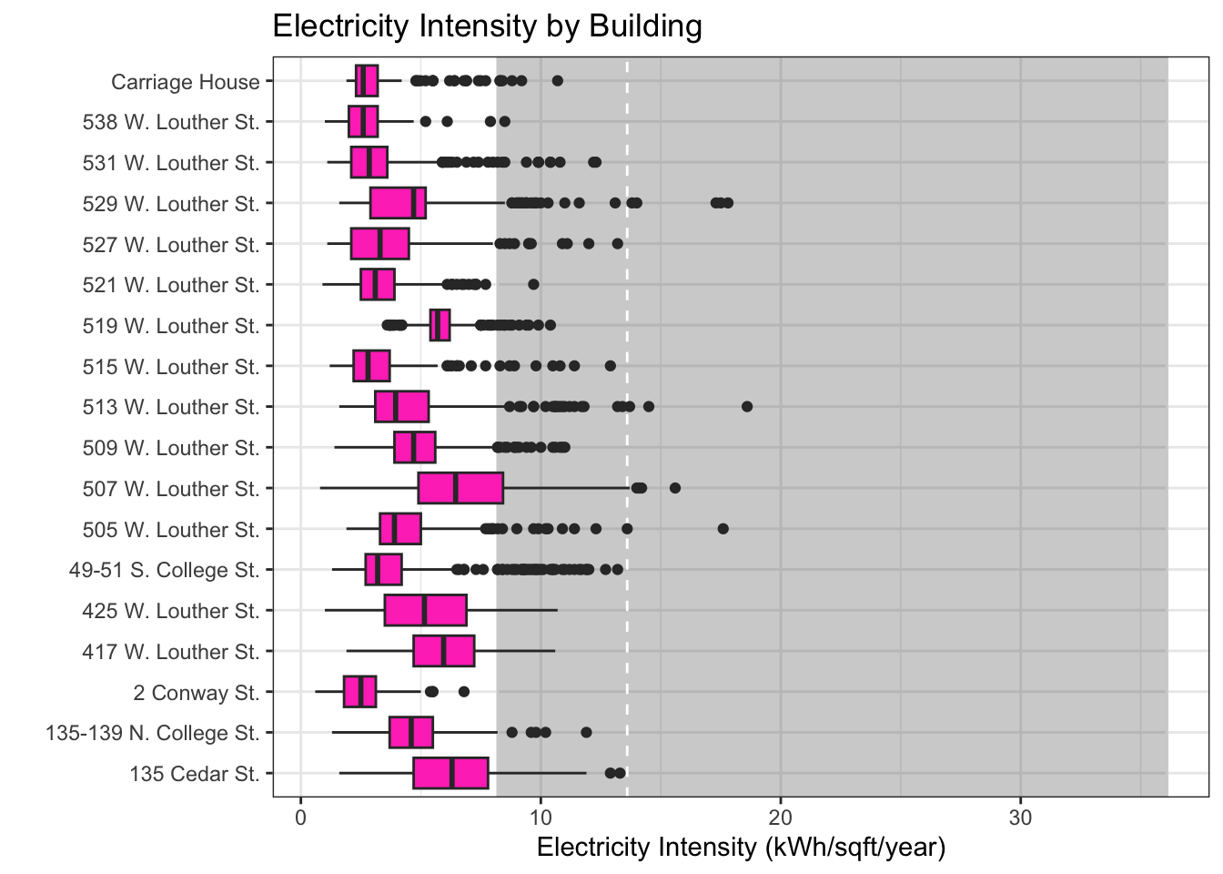 labs(title = "Electricity Intensity by Building", x = "", y = "Electricity Intensity (kWh/sqft/year)")
