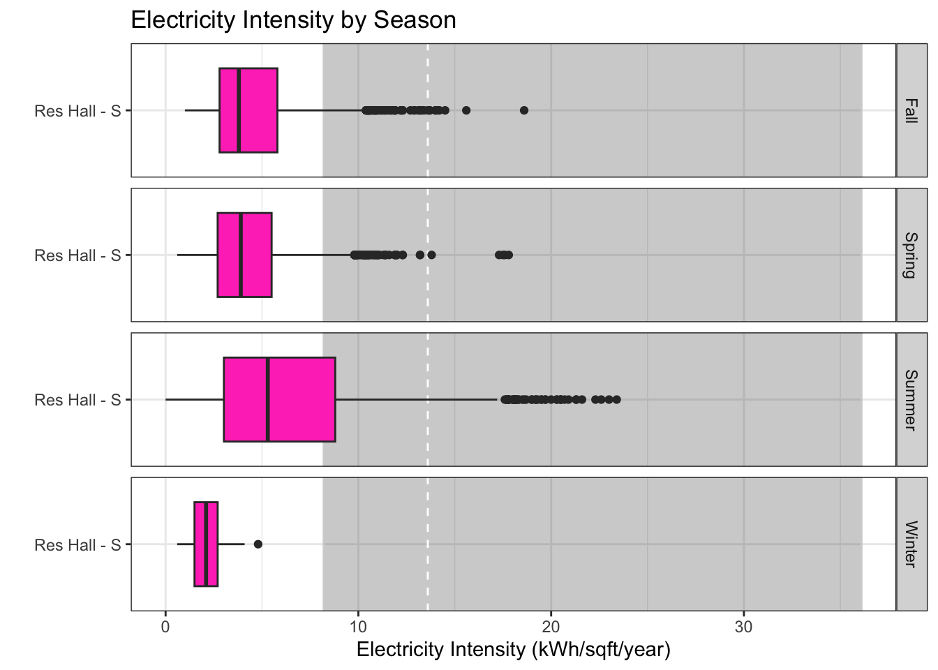 labs(title = "Electricity Intensity by Season", x = "", y = "Electricity Intensity (kWh/sqft/year)")