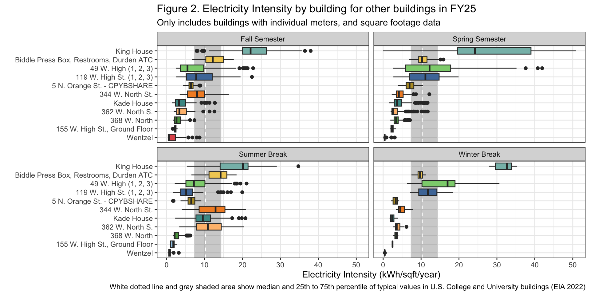 caption = "White dotted line and gray shaded area show median and 25th to 75th percentile of typical values in U.S. College and University buildings (EIA 2022)")+