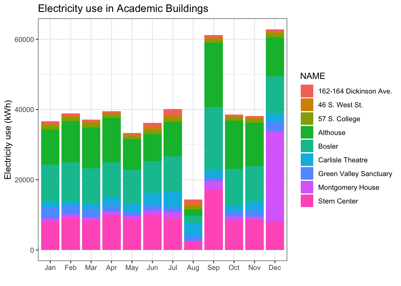 labs(x = "", y = "Electricity use (kWh)", title = "Electricity use in Academic Buildings")
