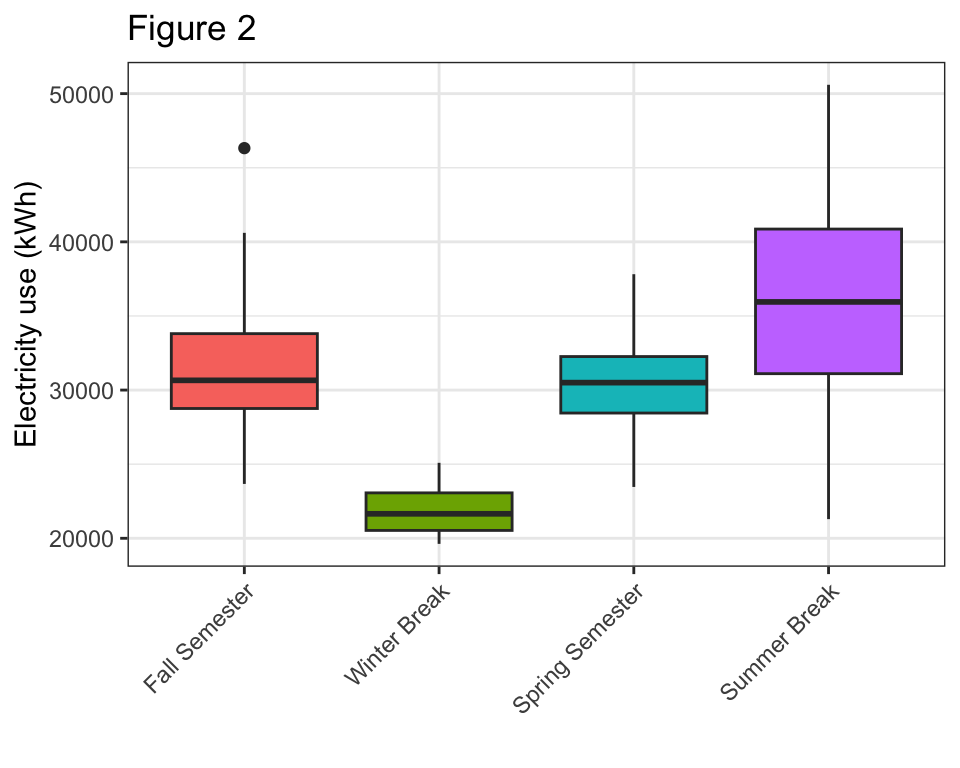 The intercept here represents the mean electricity use during fall semester, the first level in our categorical variable. The coefficients for the other periods represent the average difference between them and electricity use in fall. For example, electricity use during winter break appears to be about 9563 kWh less per day than in fall. The P values next to the individual coefficients tell us that electricity use during winter and summer break is significantly different from fall semester (P < 0.001), whereas electricity use in fall and spring are marginally different (P 0 0.08).