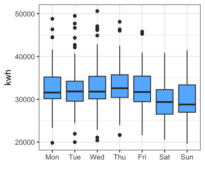 ggplot(daily_main, aes(x = wday, y = kwh, fill = wday)) +