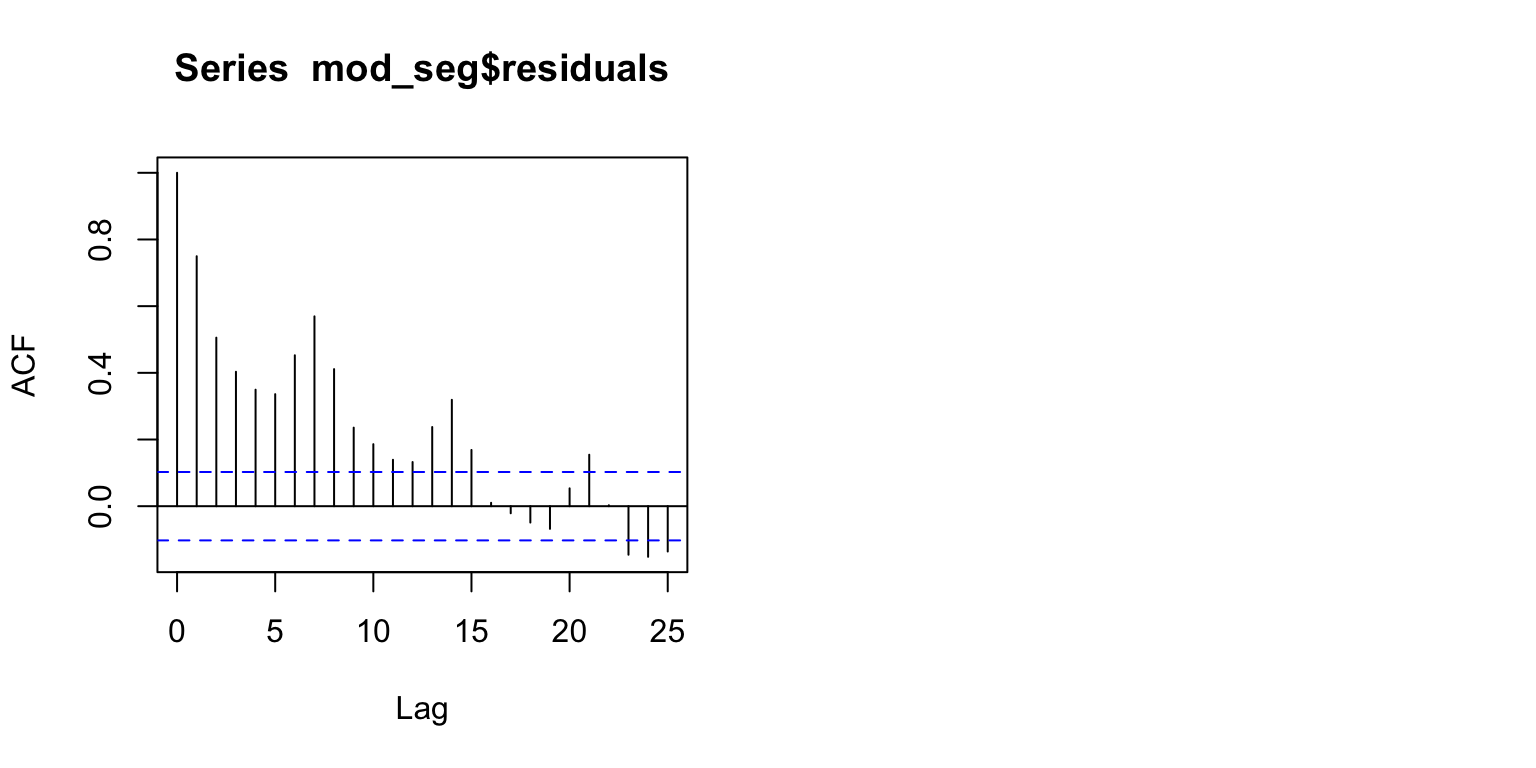 acf(mod_seg$residuals) # Assess dependence between successive observations