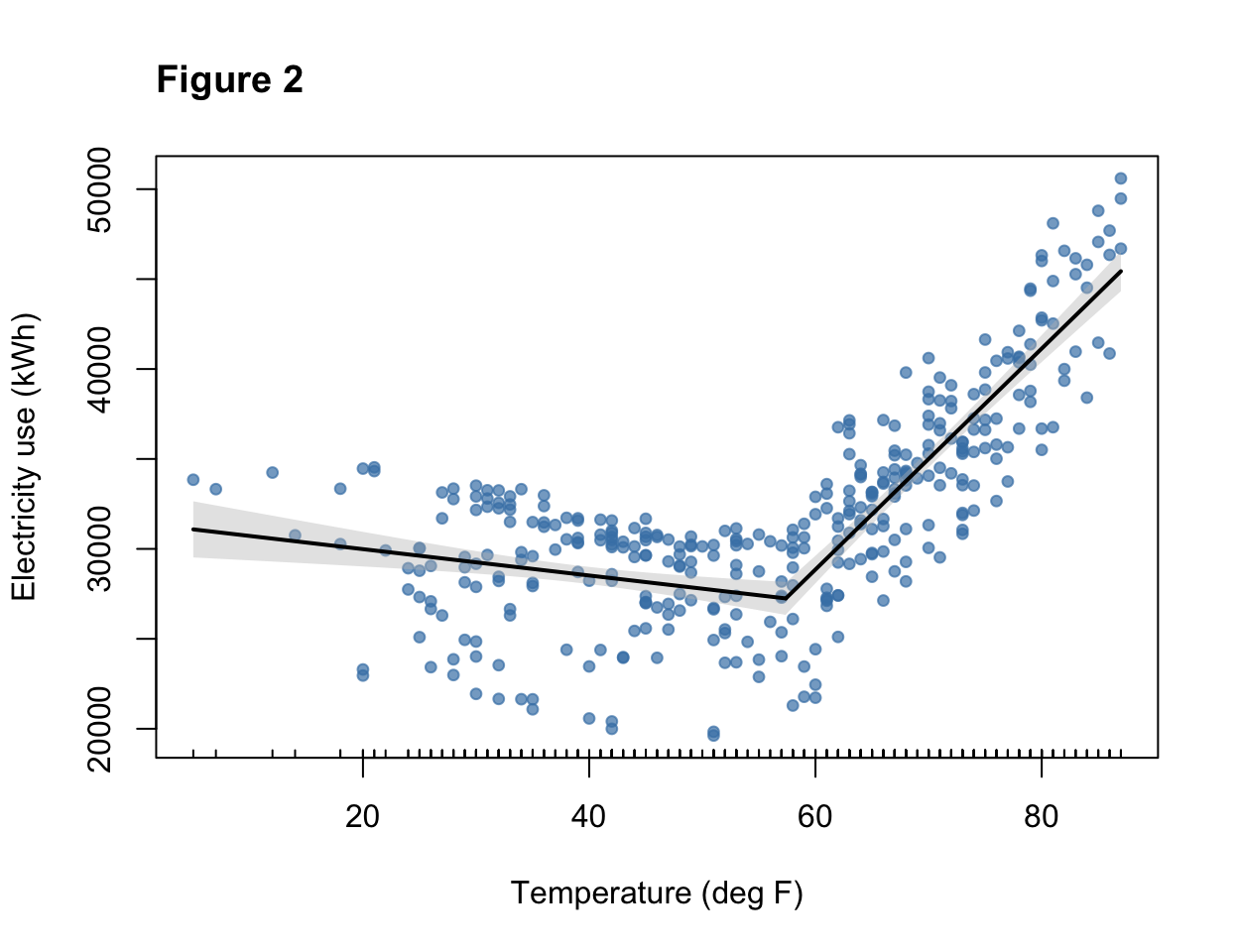 xlab = "Temperature (deg F)", ylab = "Electricity use (kWh)") # label axes