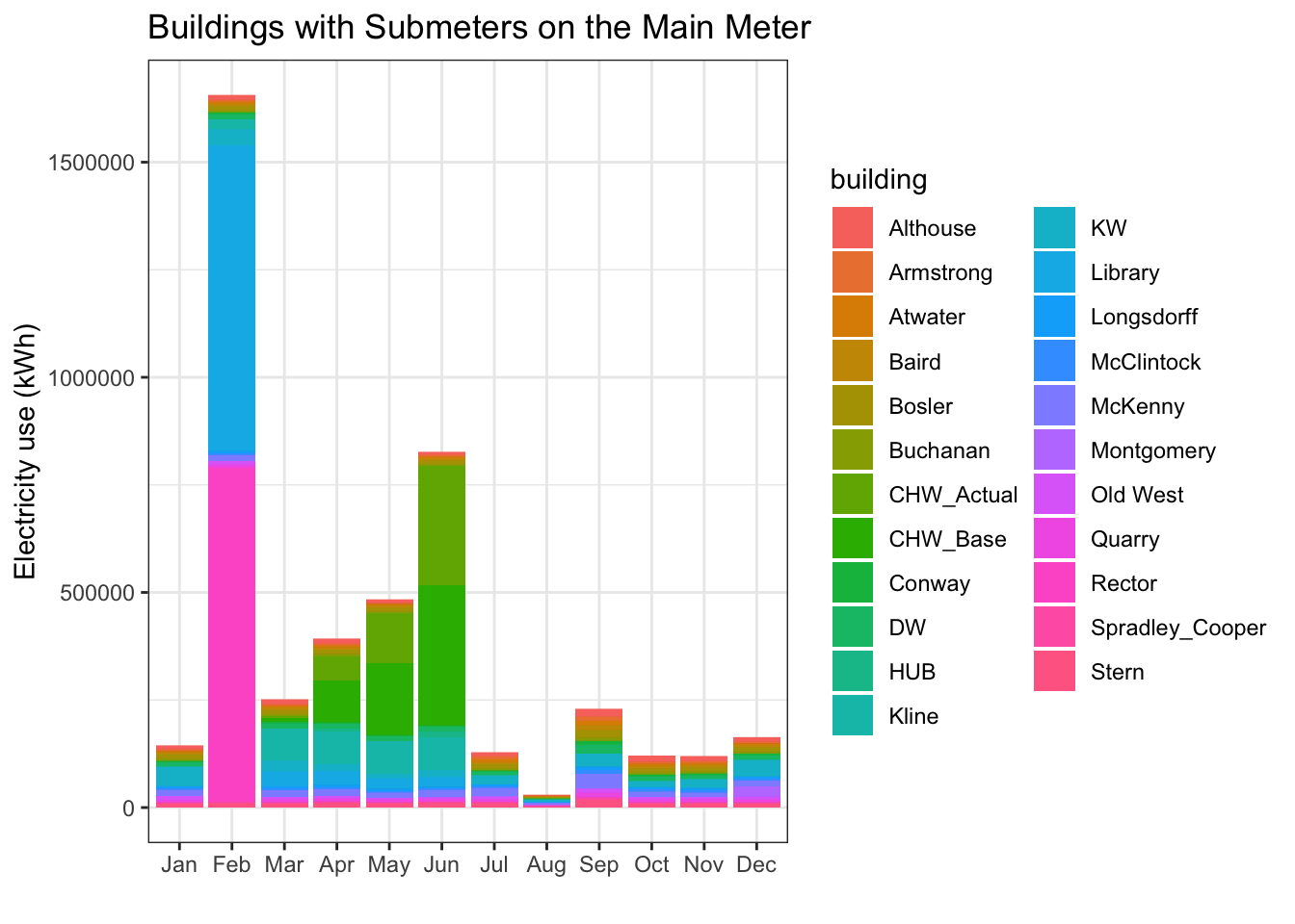 ggplot(main_bldgs, aes(x = month, y = kwh, fill = building)) +