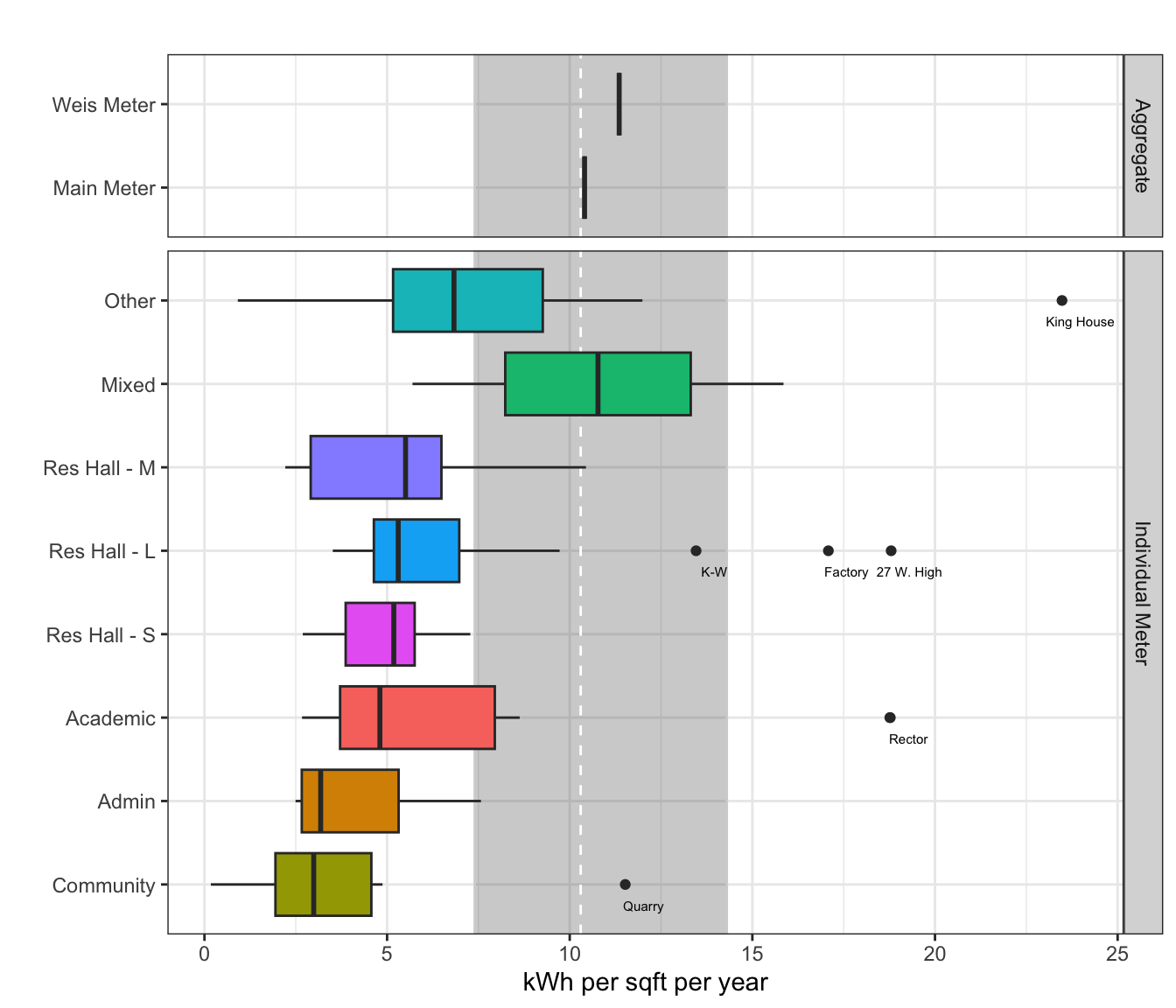 # median and IQR come from EIA (2022) table, annual kWh per square foot for Colleges/Universities