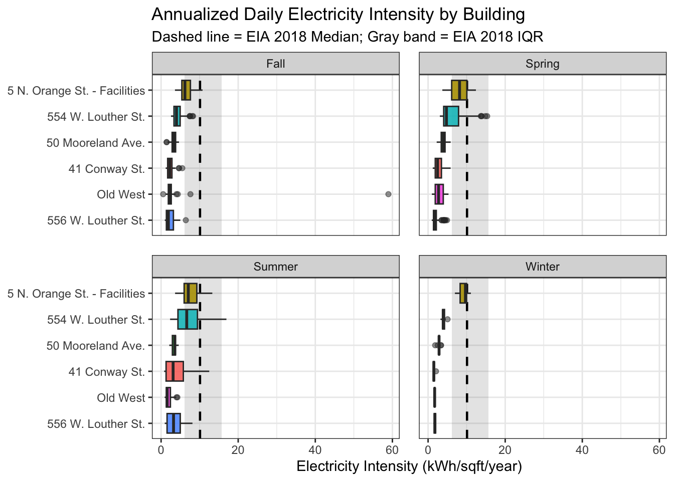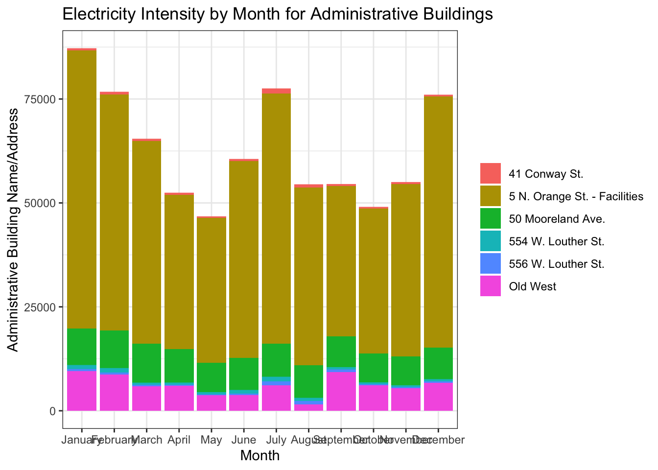 Eva created the descriptive tables for the administrative buildings and created the stacked bar chart for electricity intensity by month. It is important to note for the stacked bar chart that there is data missing for all the buildings on the Weiss Meter, including Old West, for part of August, making Old West’s total kWh for the month much lower than reality. Amiya created the ranked boxplot for annual total kwh by administrative building using the EIA 2018 report measurements of spread.