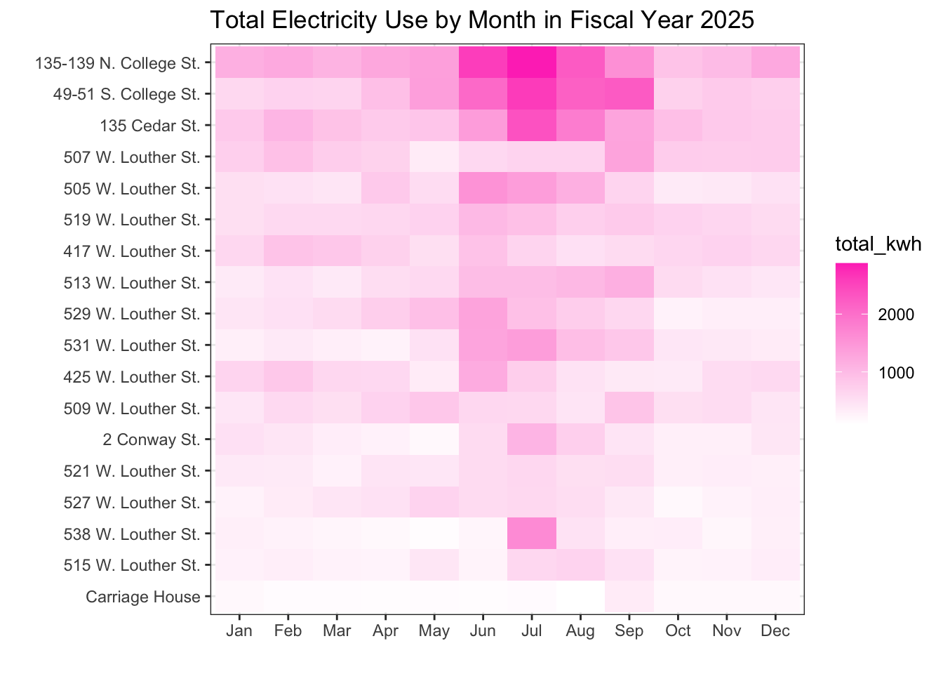 labs(title = "Total Electricity Use by Month in Fiscal Year 2025") + theme_bw() + labs(x = "", y = "")
