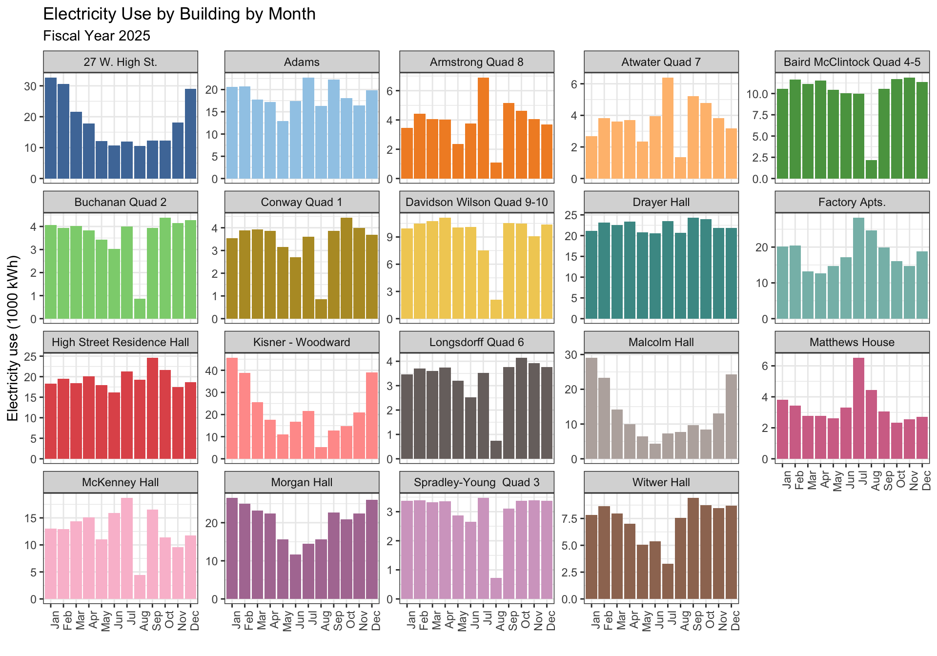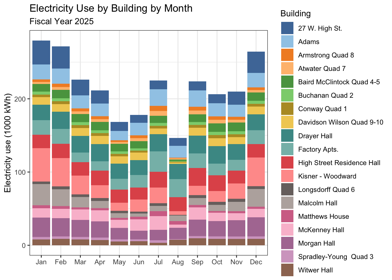 title = "Electricity Use by Building by Month",