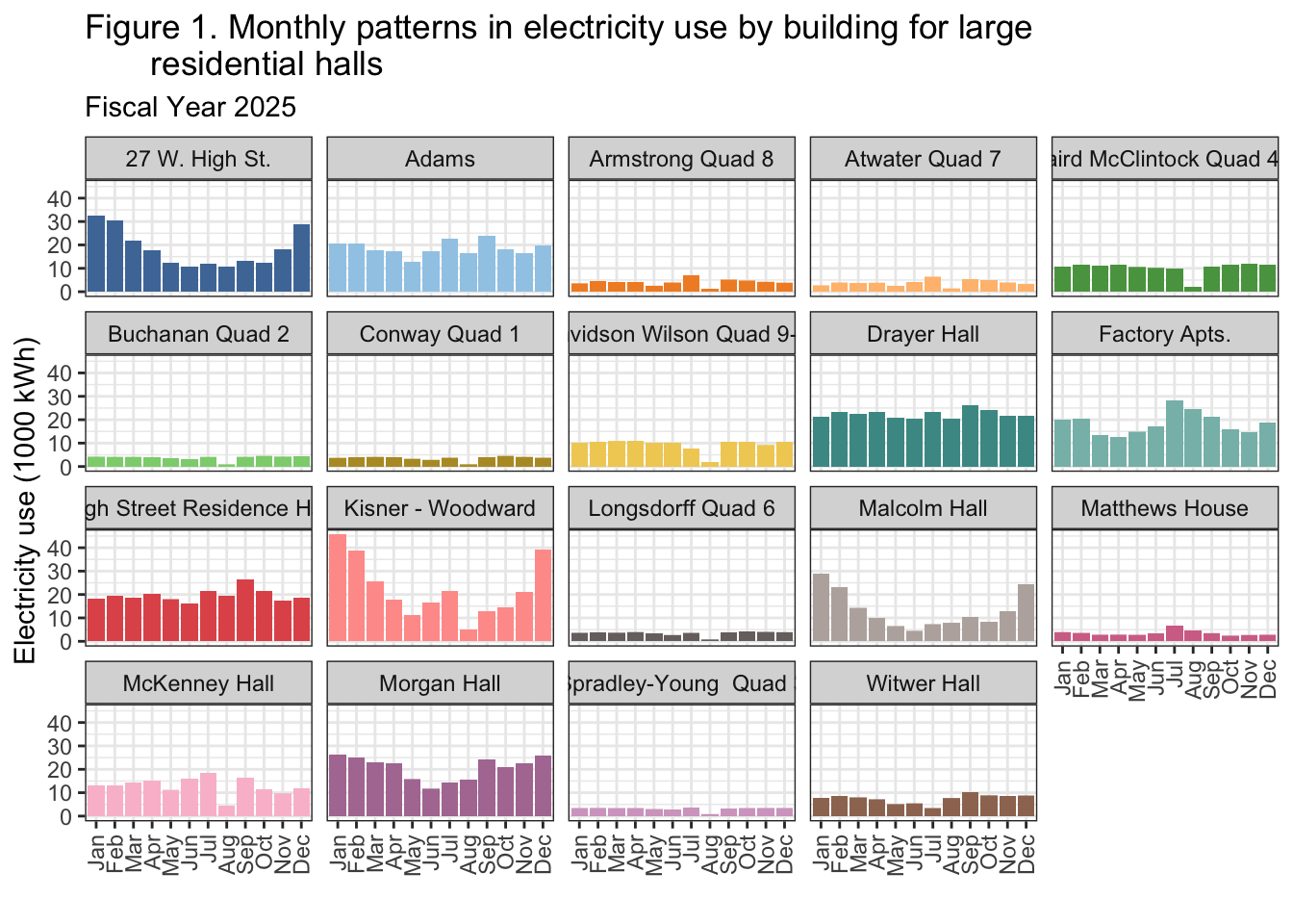 Figure 1 shows the monthly patterns in electricity use during fiscal year 2025. Some buildings, such as Kisner-Woodward and 27 W. High Street, have a distinct u-shape, indicating higher use during winter months, and lower use during the summer months. The buildings with this shape also tend to have the highest electricity usage. However, the majority of buildings have a flat shape, showing that electricity use did not differ much during any point of the year. It is also notable that more than half of the buildings have a dip during either July or August where there is very little electricity use.